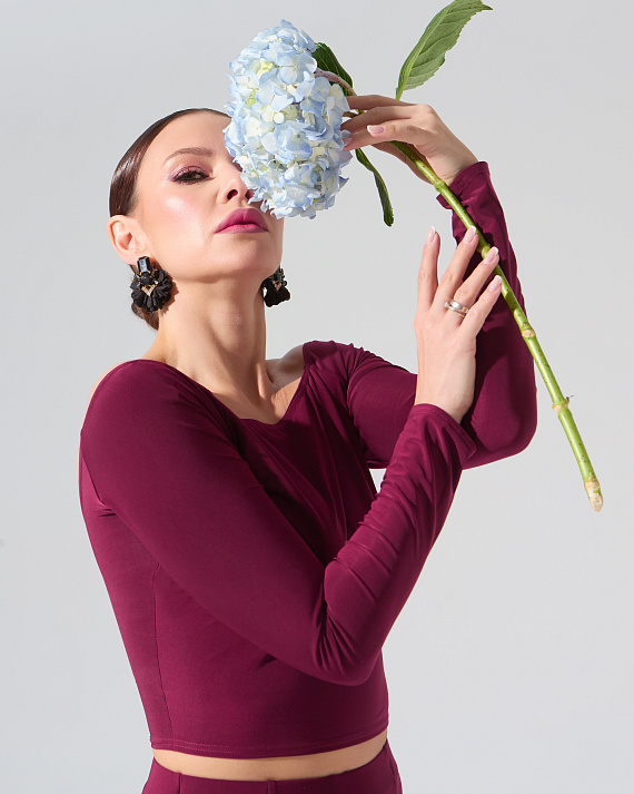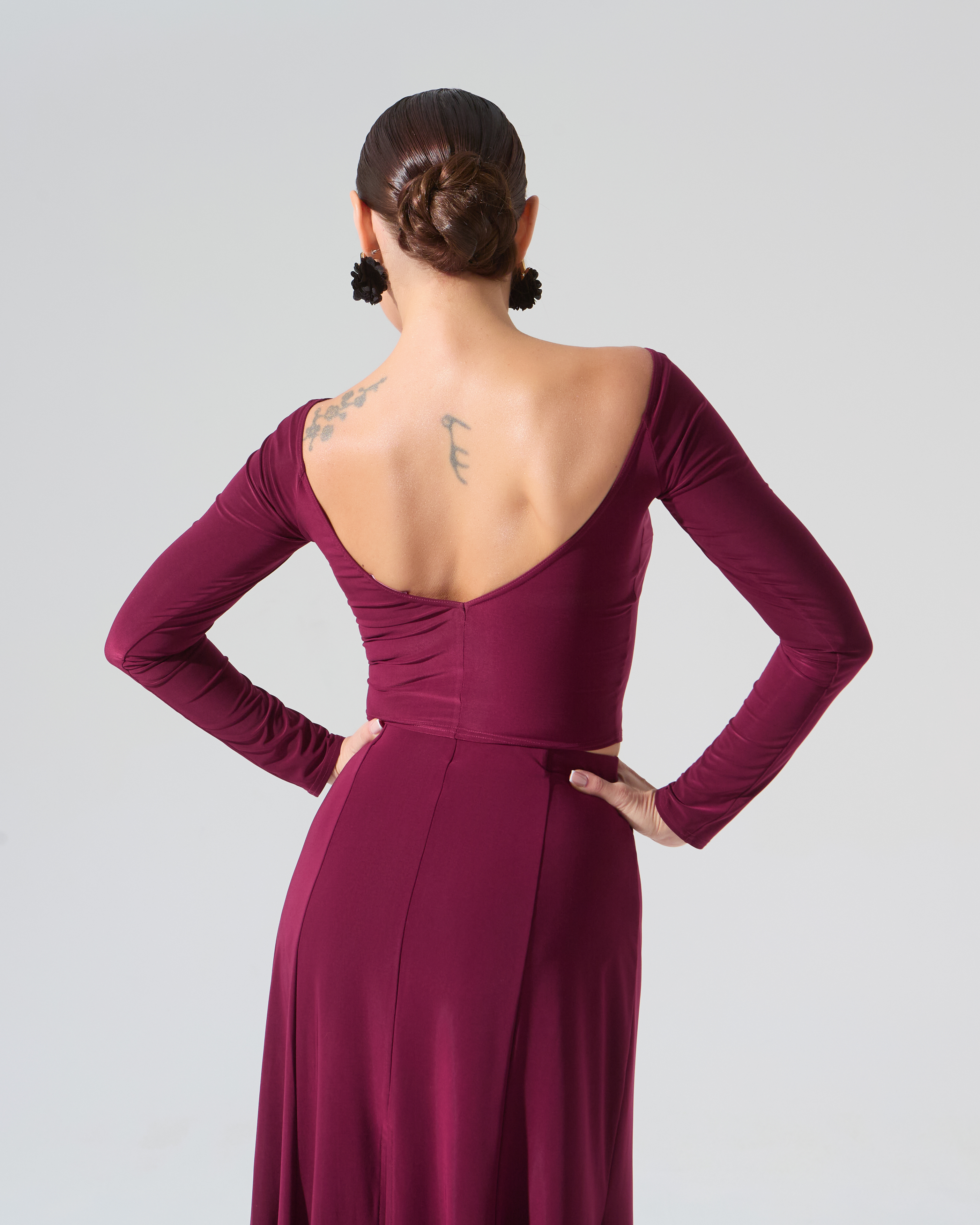 Заниженная линия плеча, вырез «лодочка» и открытая спинка — это всегда элегантно и эстетично.