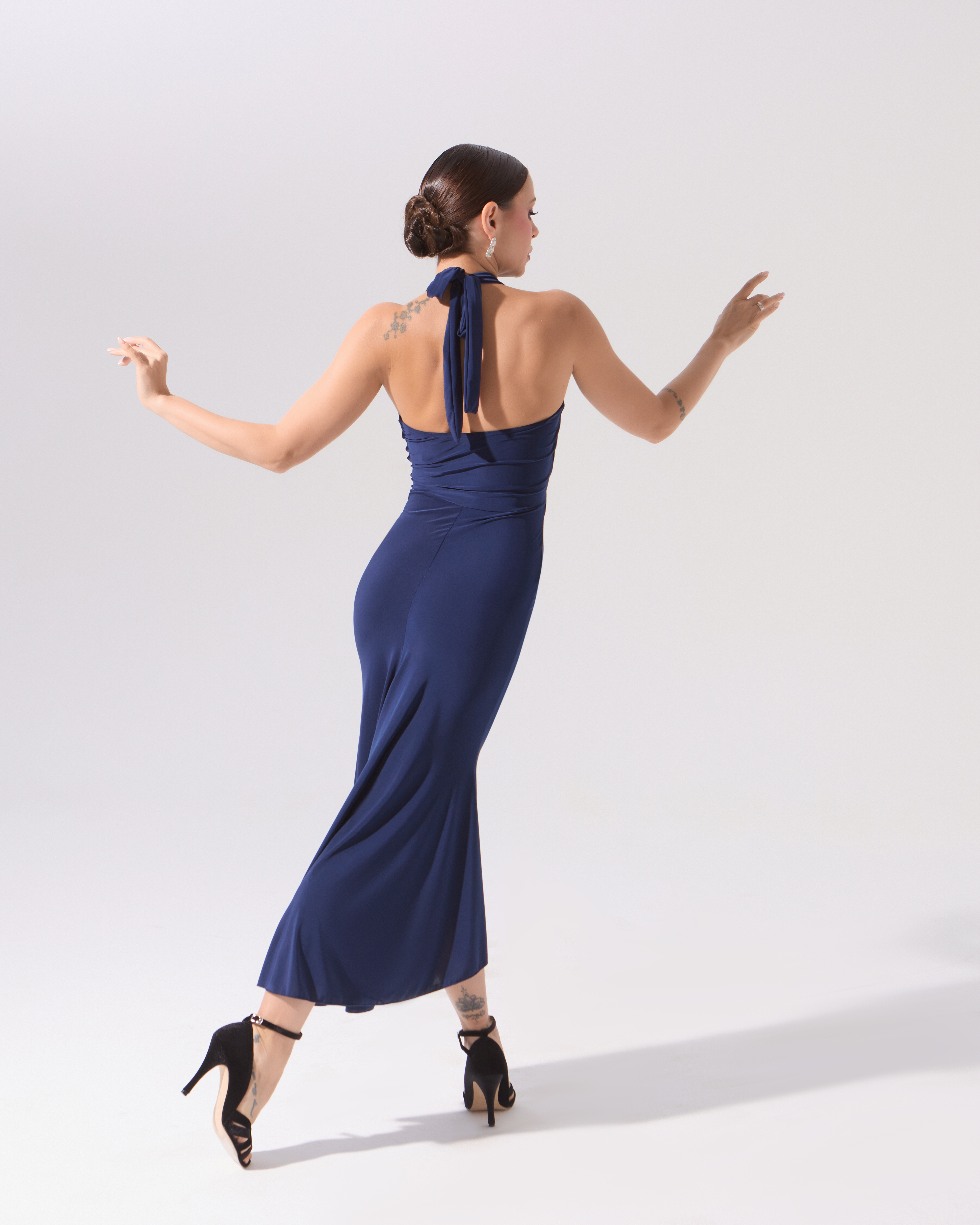 Динамичное и летящее платье с клиньями, невероятно красивый лиф с перекрутом и открытая спинка — все, что нужно, чтобы произвести яркое впечатление, исполняя самый страстное танго.