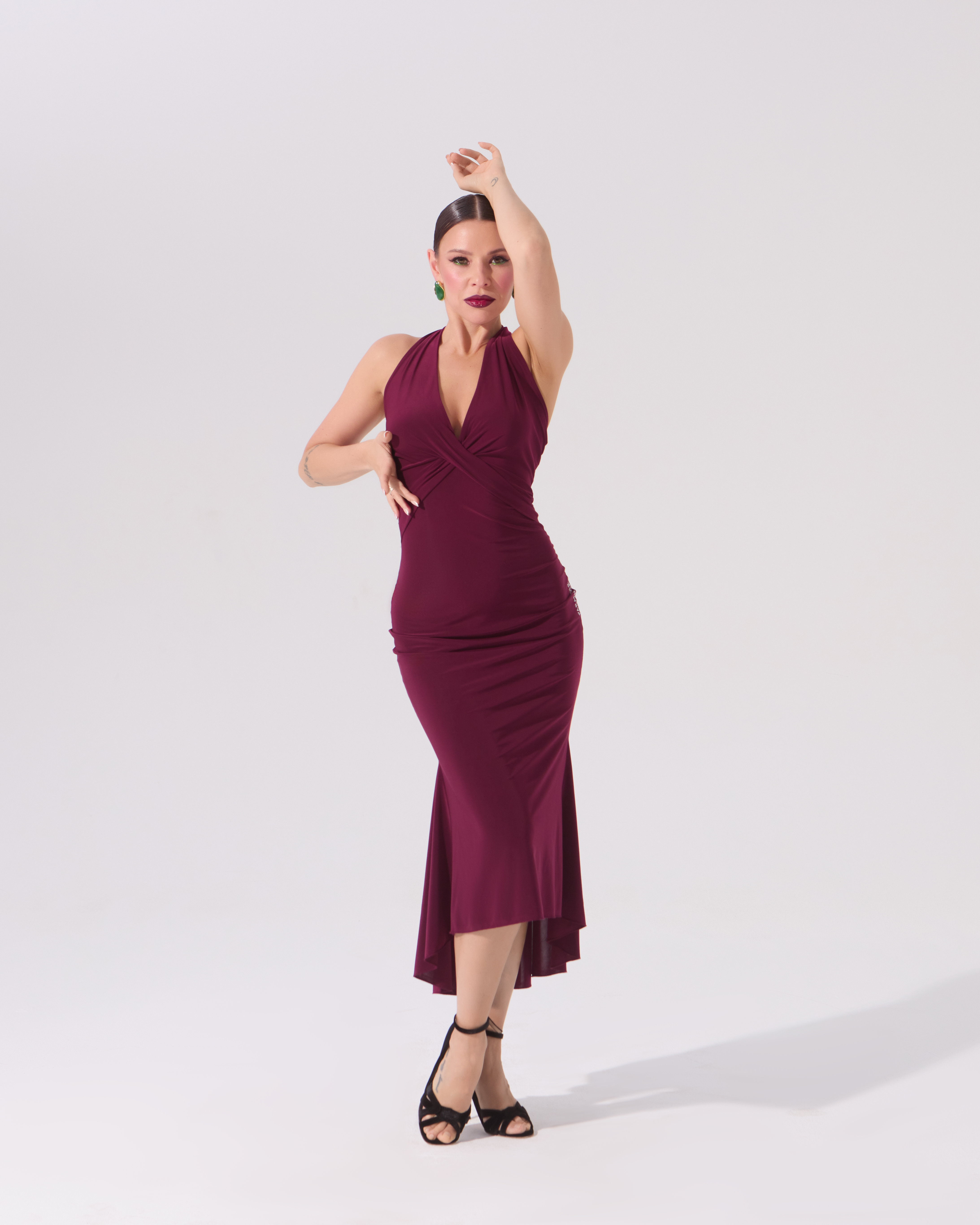 Динамичное и летящее платье с клиньями, невероятно красивый лиф с перекрутом и открытая спинка — все, что нужно, чтобы произвести яркое впечатление, исполняя самый страстное танго.