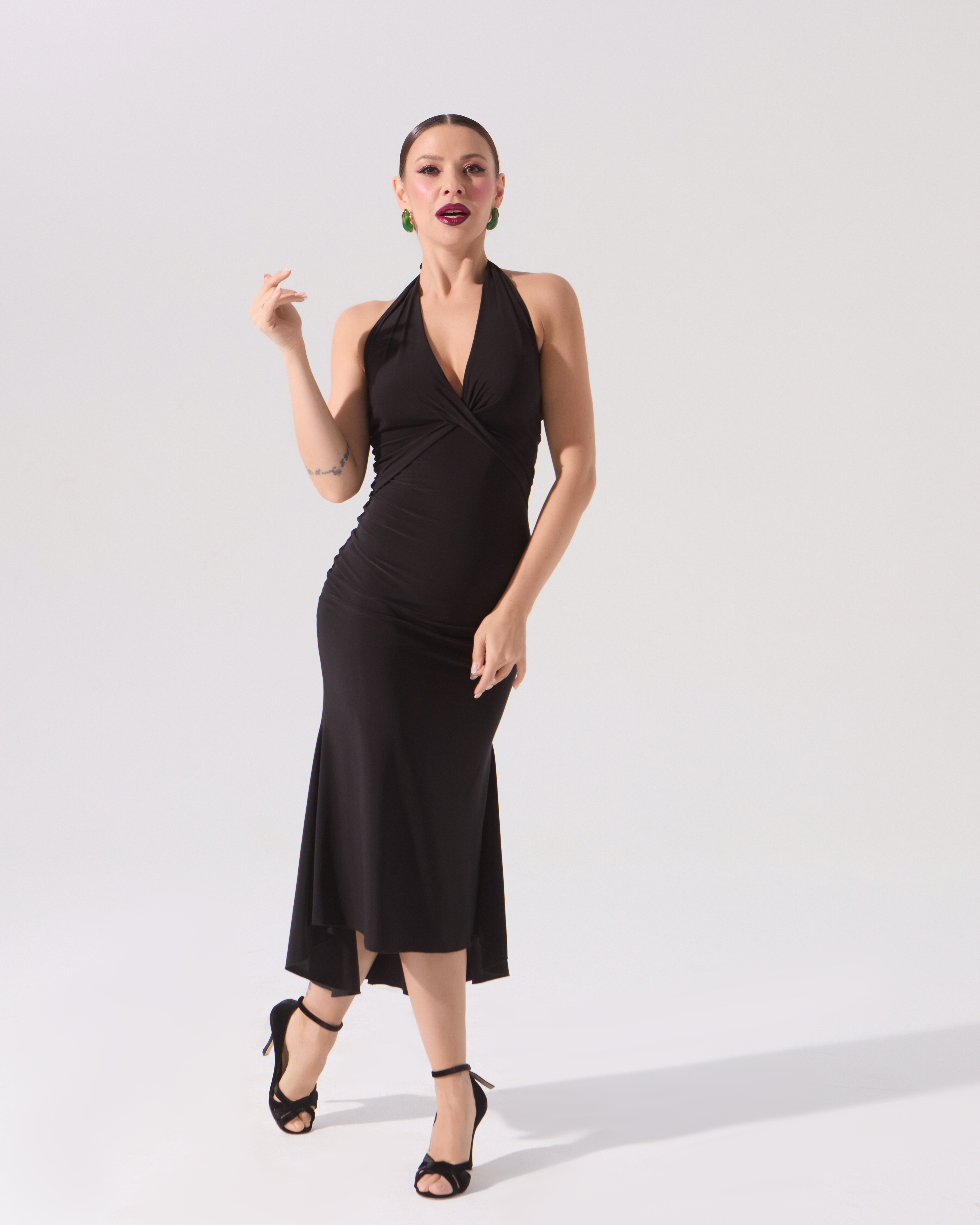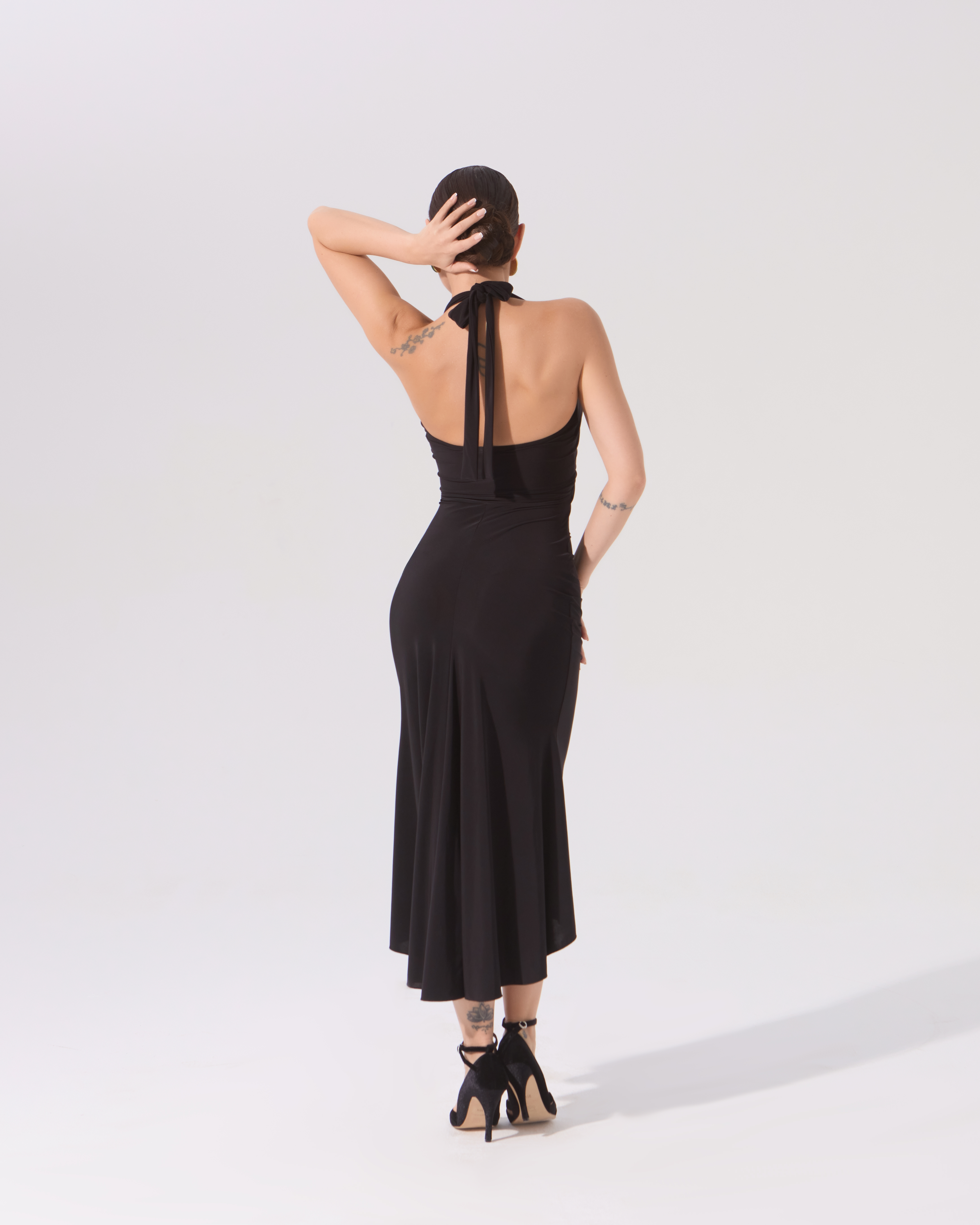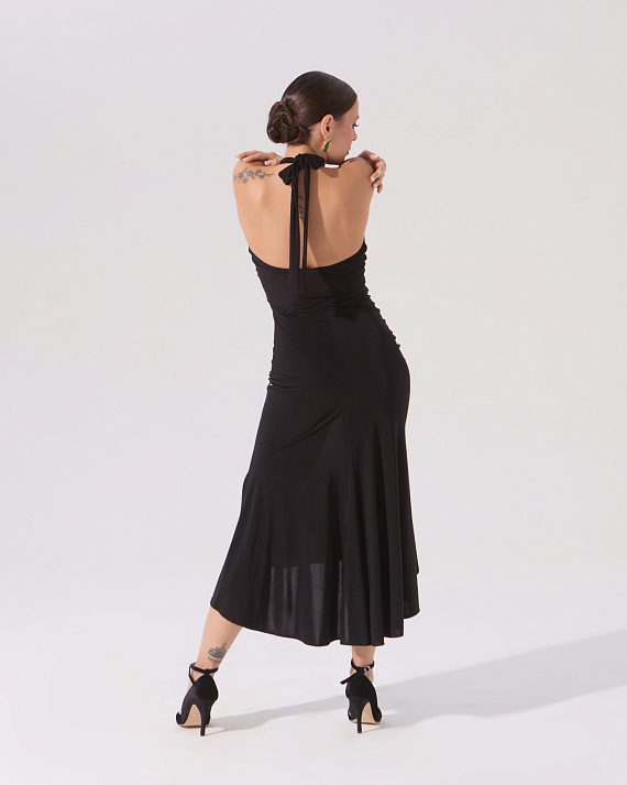 Динамичное и летящее платье с клиньями, невероятно красивый лиф с перекрутом и открытая спинка — все, что нужно, чтобы произвести яркое впечатление, исполняя самый страстное танго.