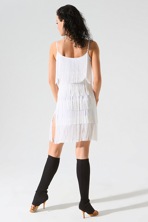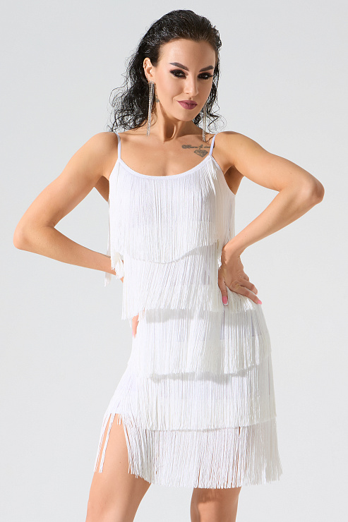 Платье мини с бахромой от бренда танцевальной одежды FARANDOLE — наш «хит» с 2009 года. Оно идеально своей простотой. Длина "мини", разрезы по бокам, тонкие изящные бретели с регуляторами и много ярусов бахромы длиной 20 см — идеально и на все времена! На тренировку, выступление или вечеринку.
