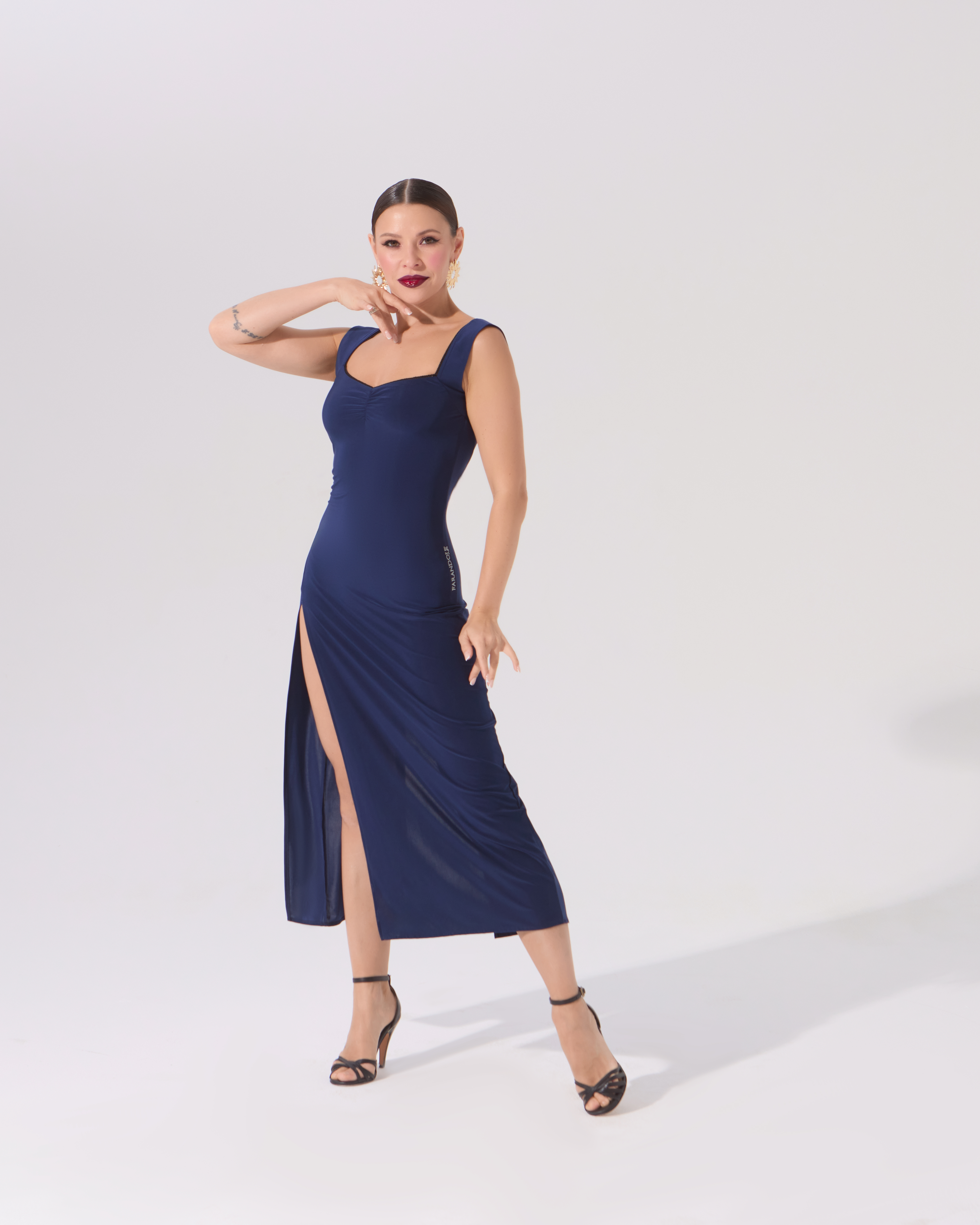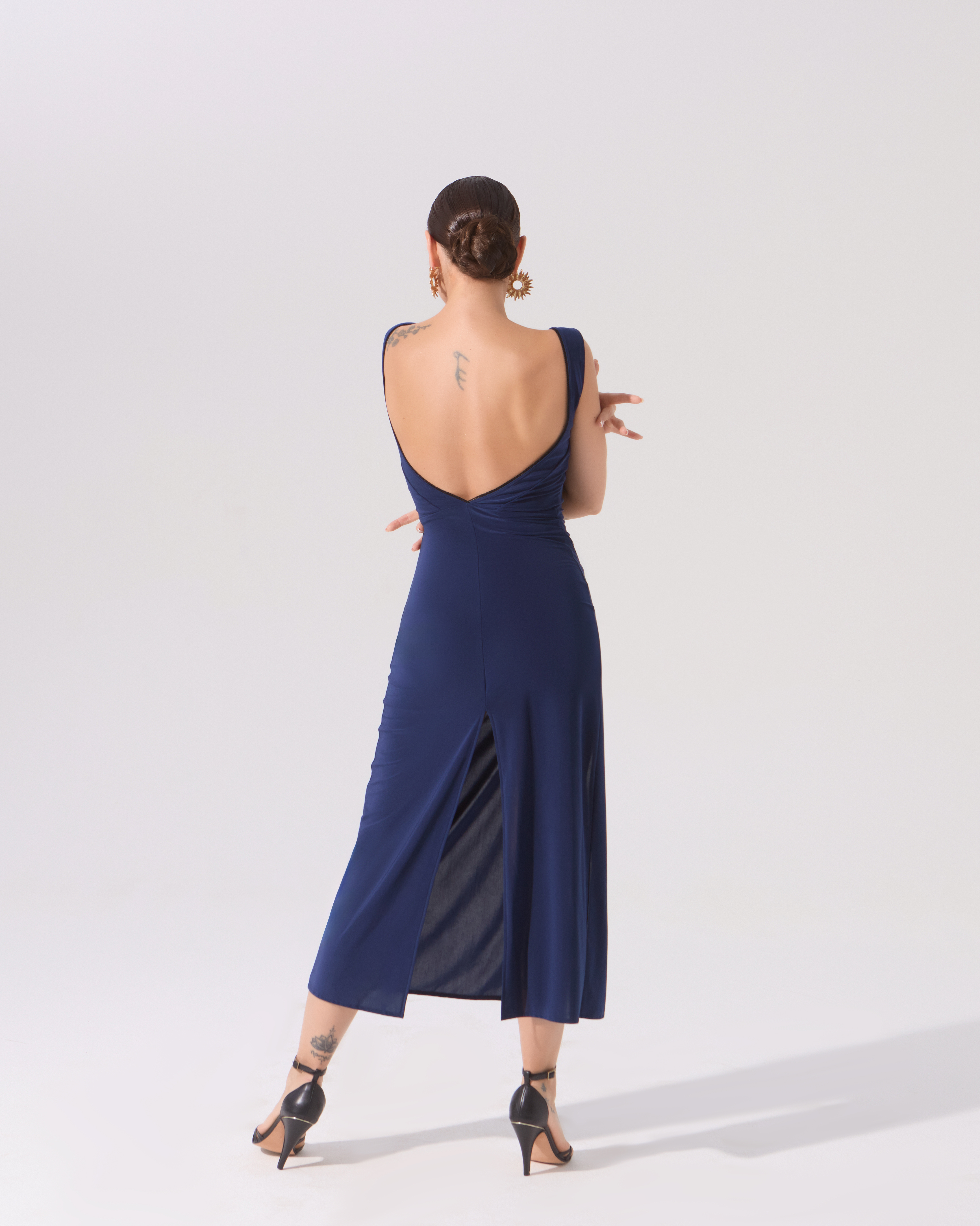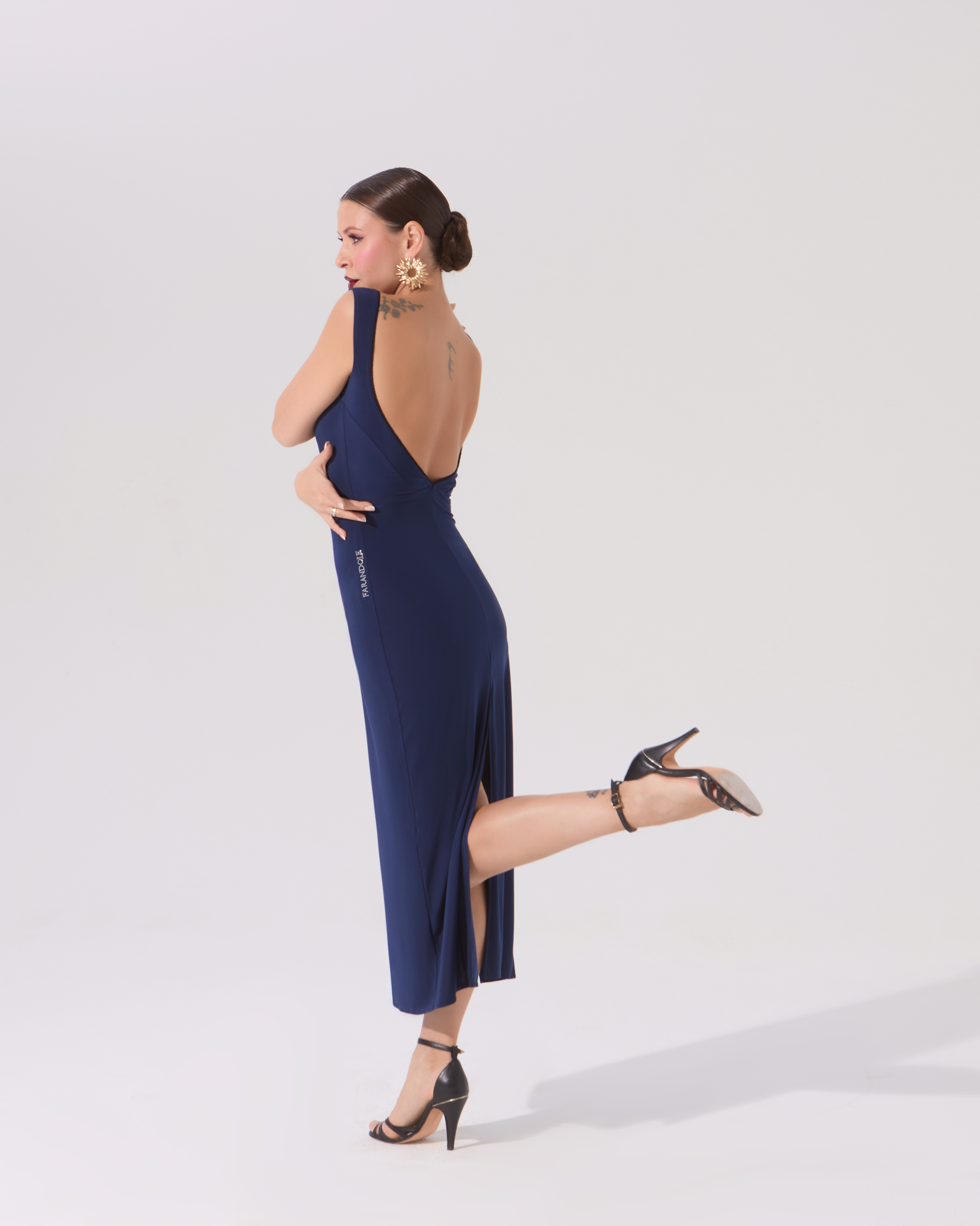 Платье с открытой спиной и разрезами — вечная классика для аргентинского танго. Разрезы сбоку и сзади дают свободу движениям и подчеркивают красоту женских ног.