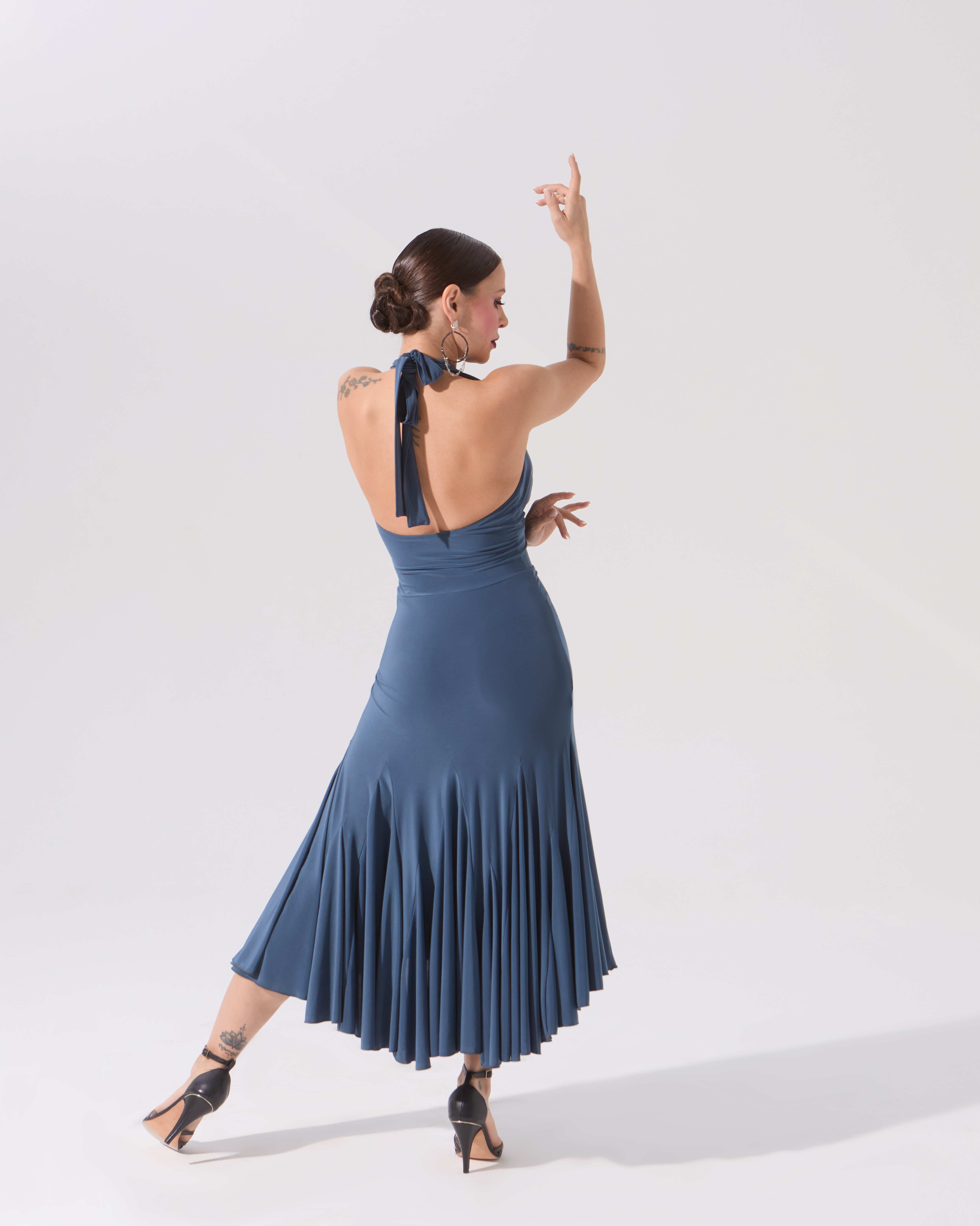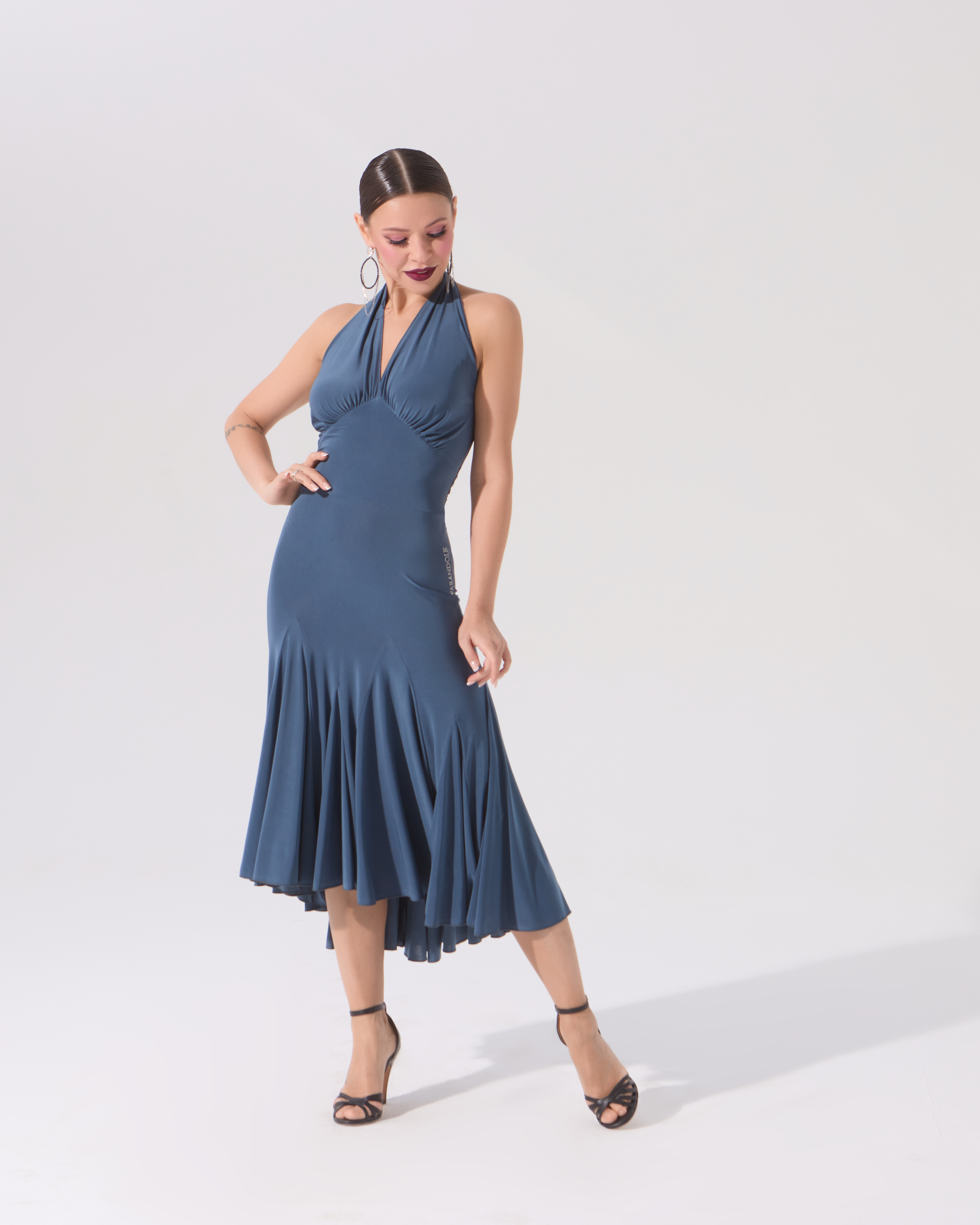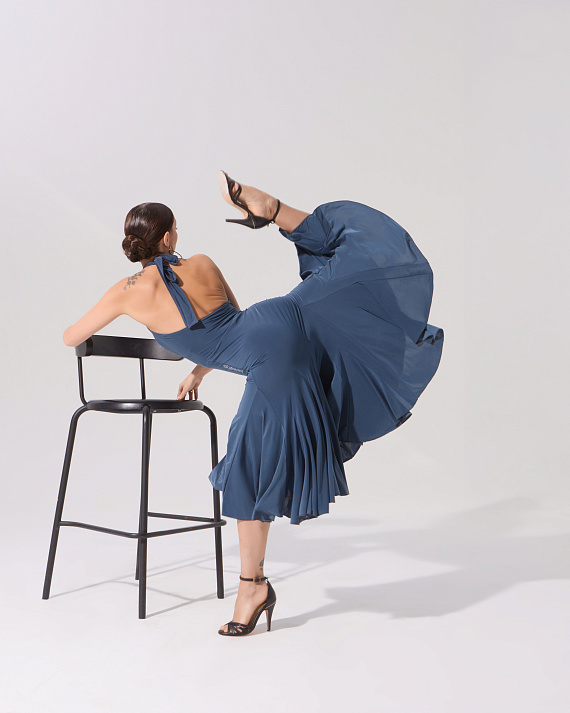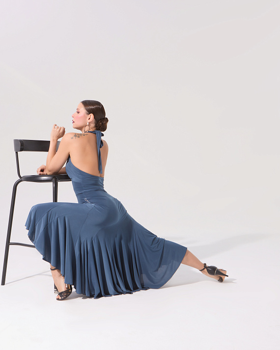 Динамичное и летящее платье с клиньями, невероятно красивый лиф с завязками на шее и открытая спинка — все, что нужно, чтобы произвести яркое впечатление, исполняя самый страстное танго. Двуслойный лиф позволяет вложить чашечки.