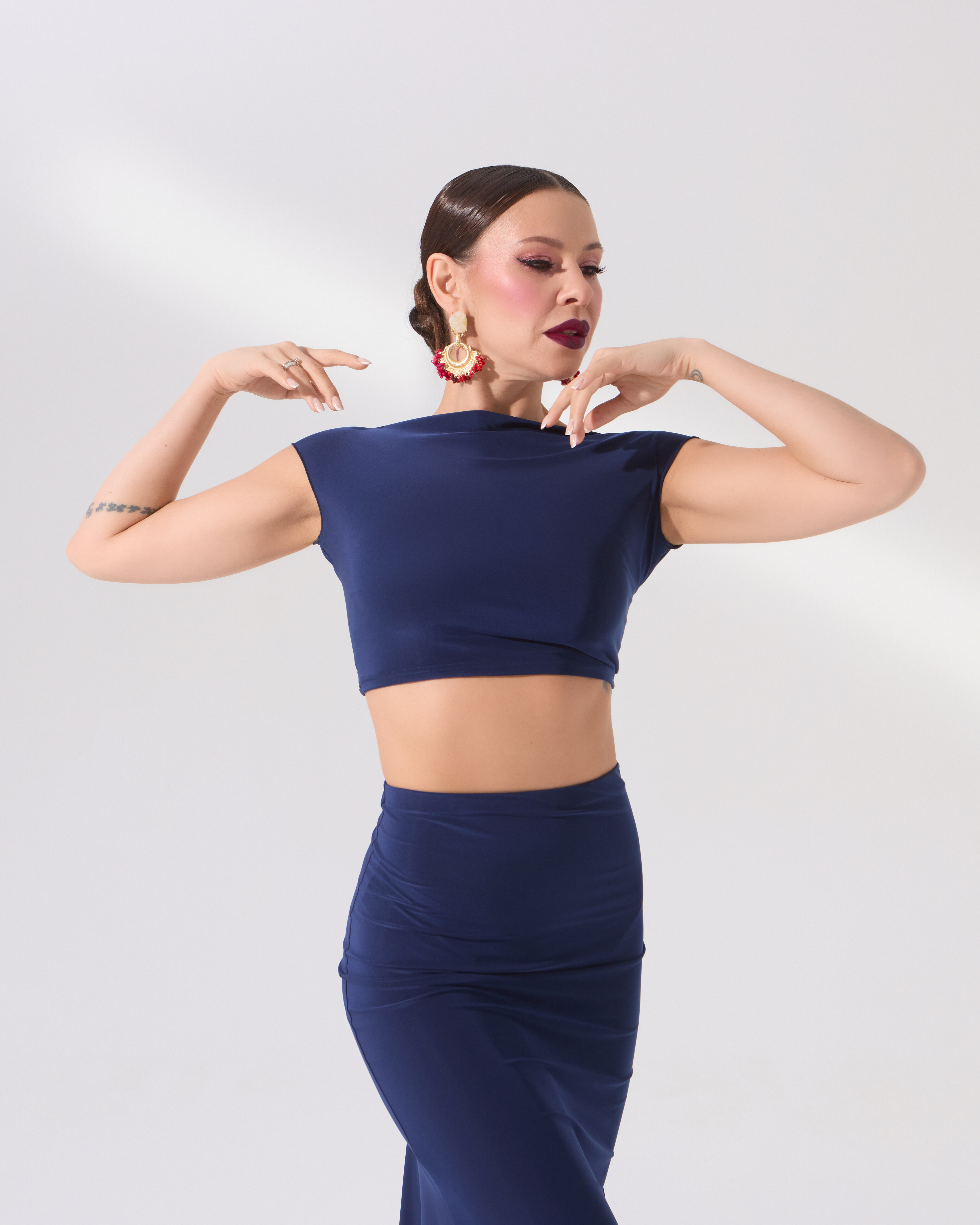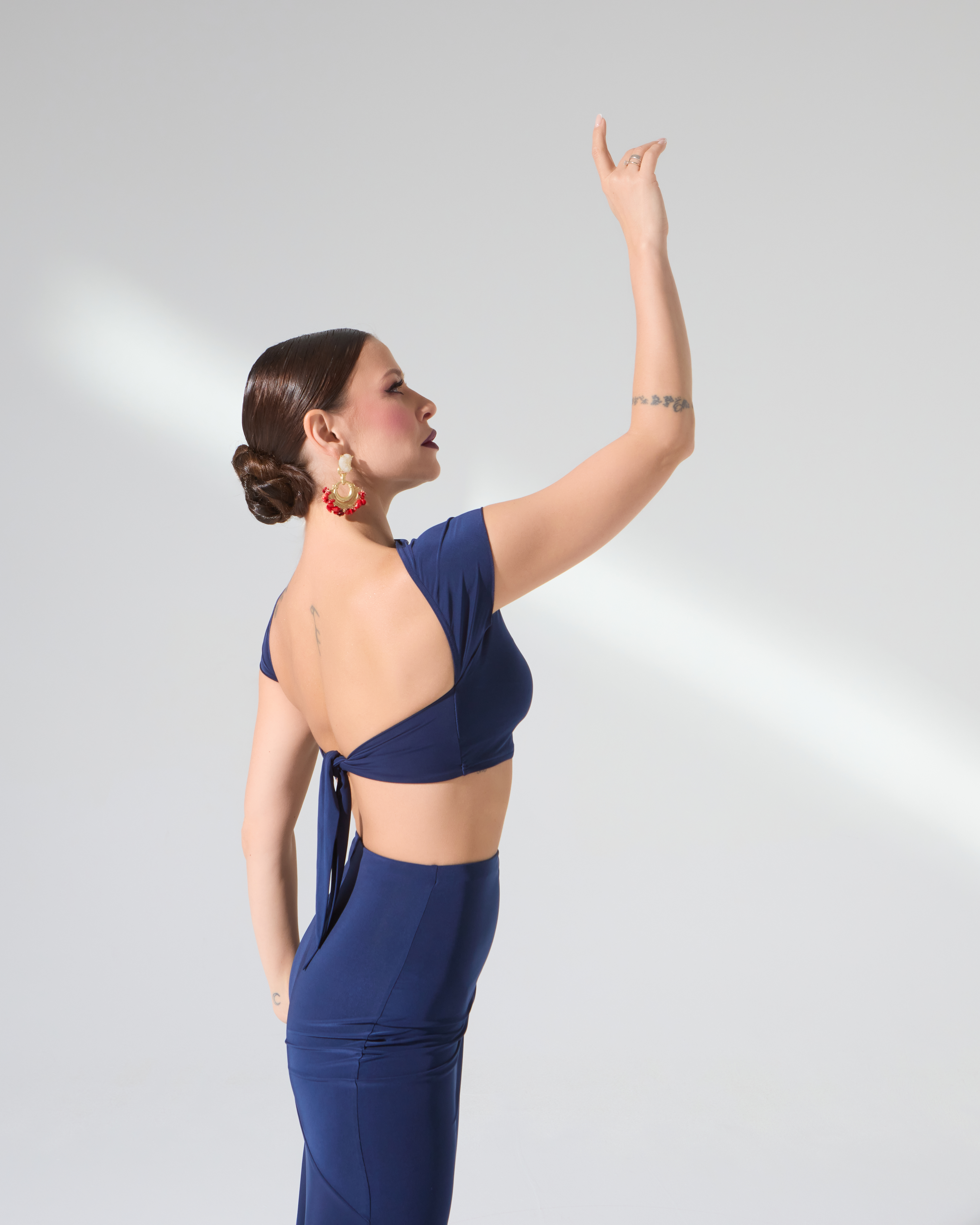 Топ с завязкой на спине, эстетично открывающий спину, имеет очень красивую линию «лодочки» на горловине, переходящую в рукав. Топ прекрасно подойдет для танго, латины, стандарты или повседневного образа летом.