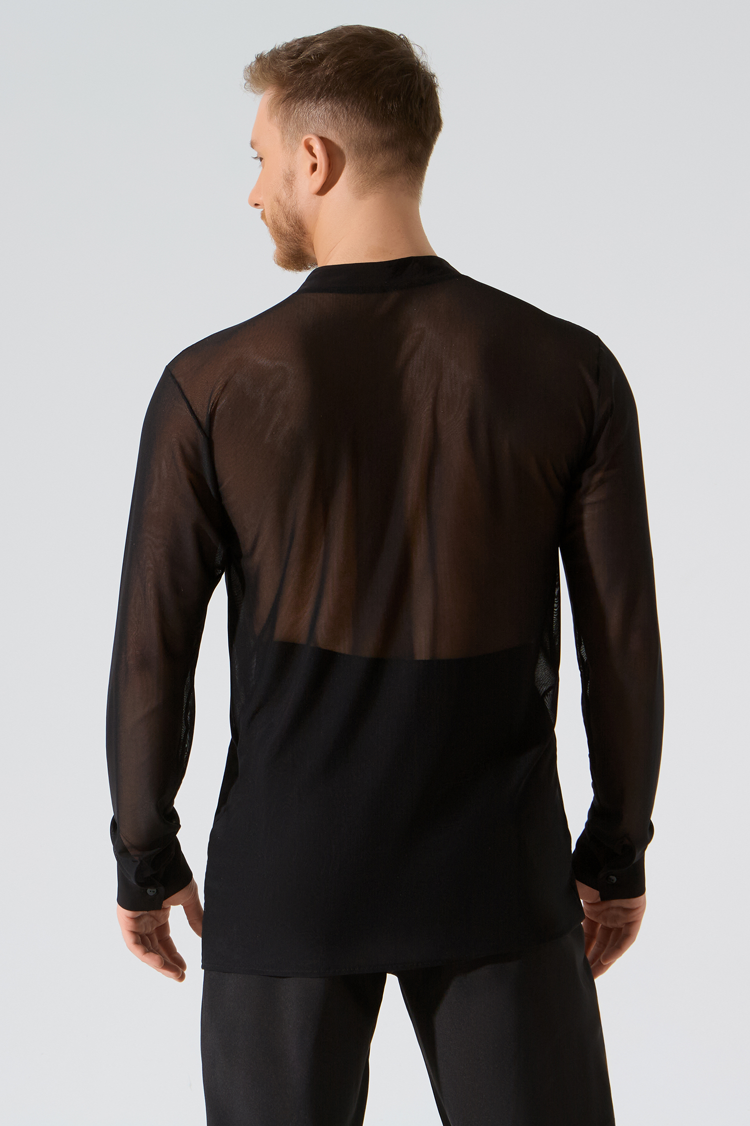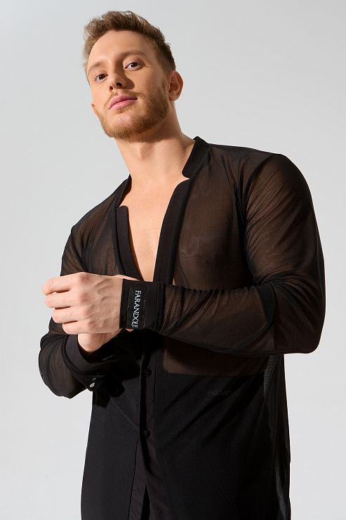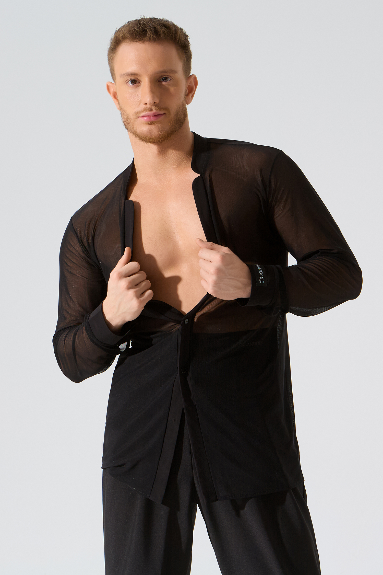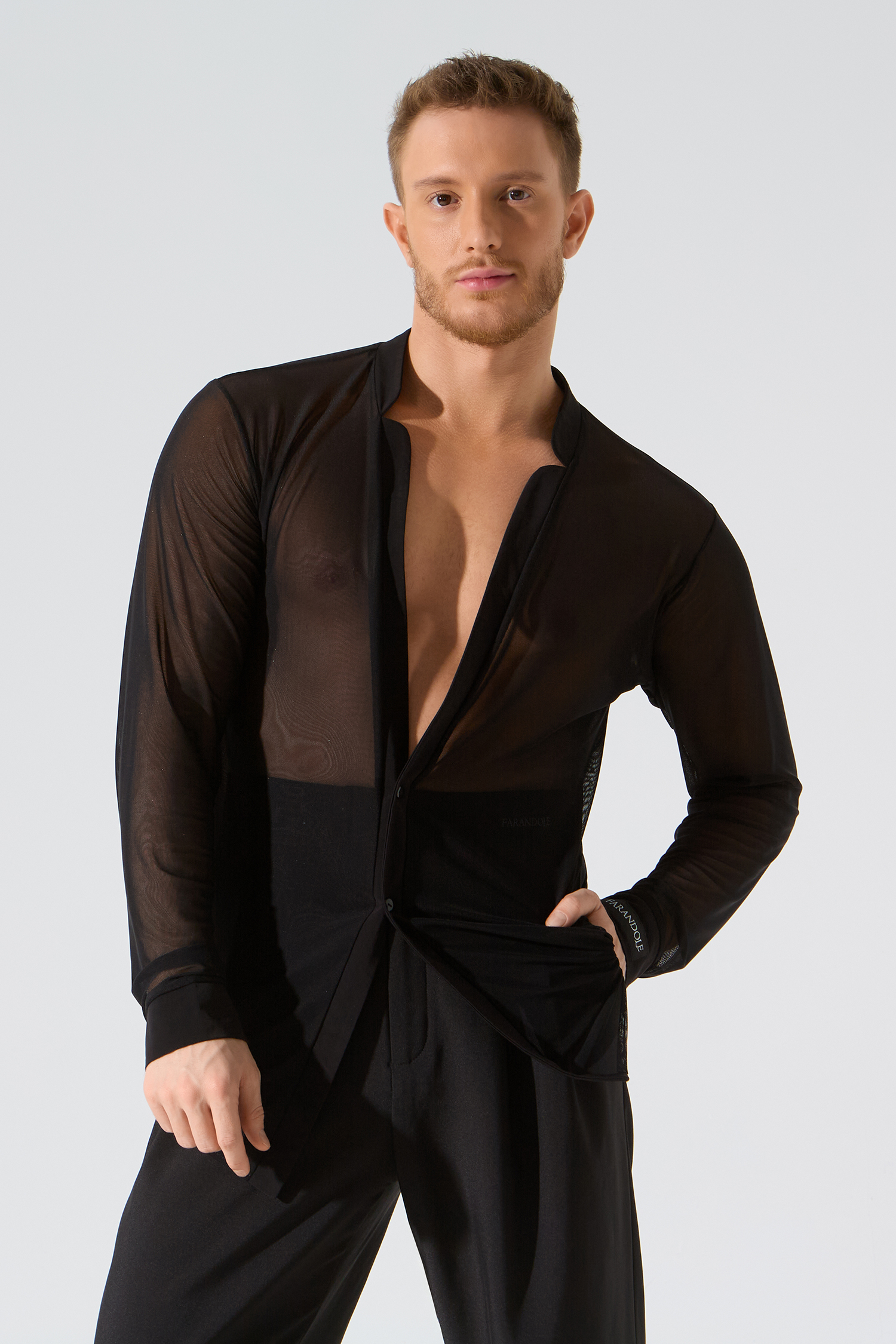 Мужская рубашка из сетки — тренд в танцевальном мире. В сочетании с тонким и комфортным материалом «масло» в качестве отделки воротника, планки и манжет рубашка смотрится особенно стильно. Мы рекомендуем сочетать рубашку с майкой из бамбука.