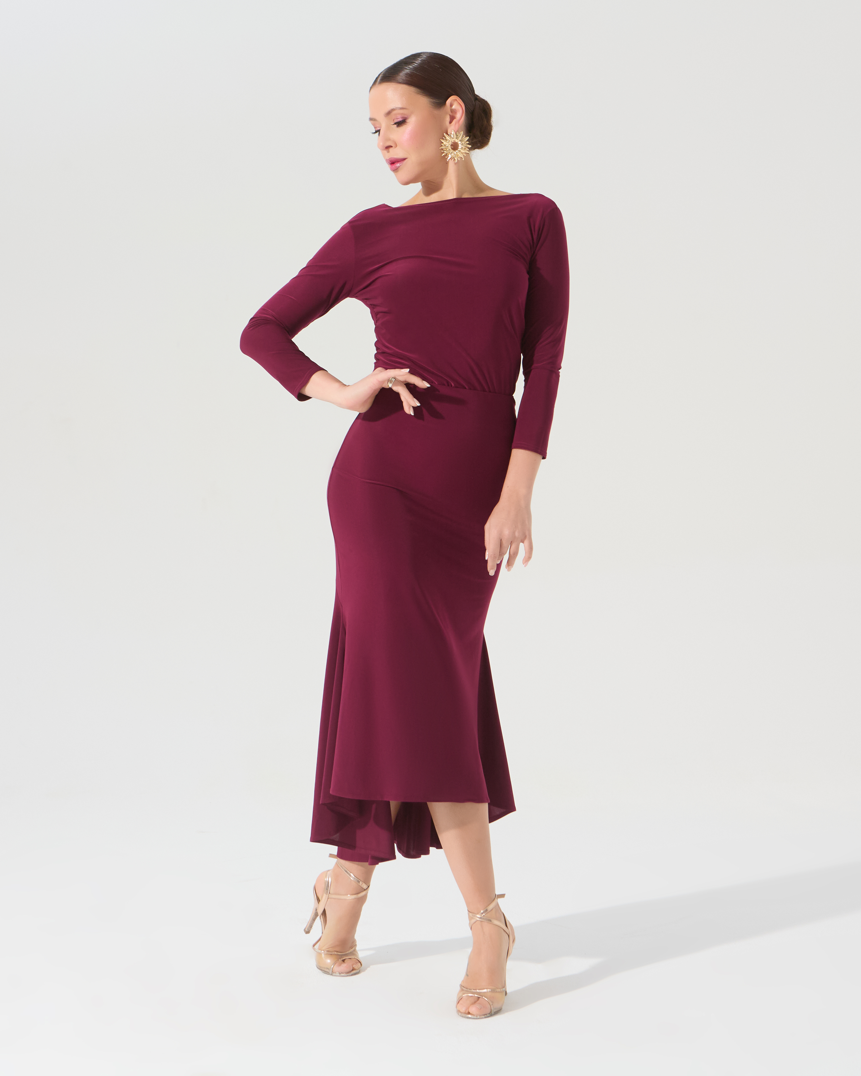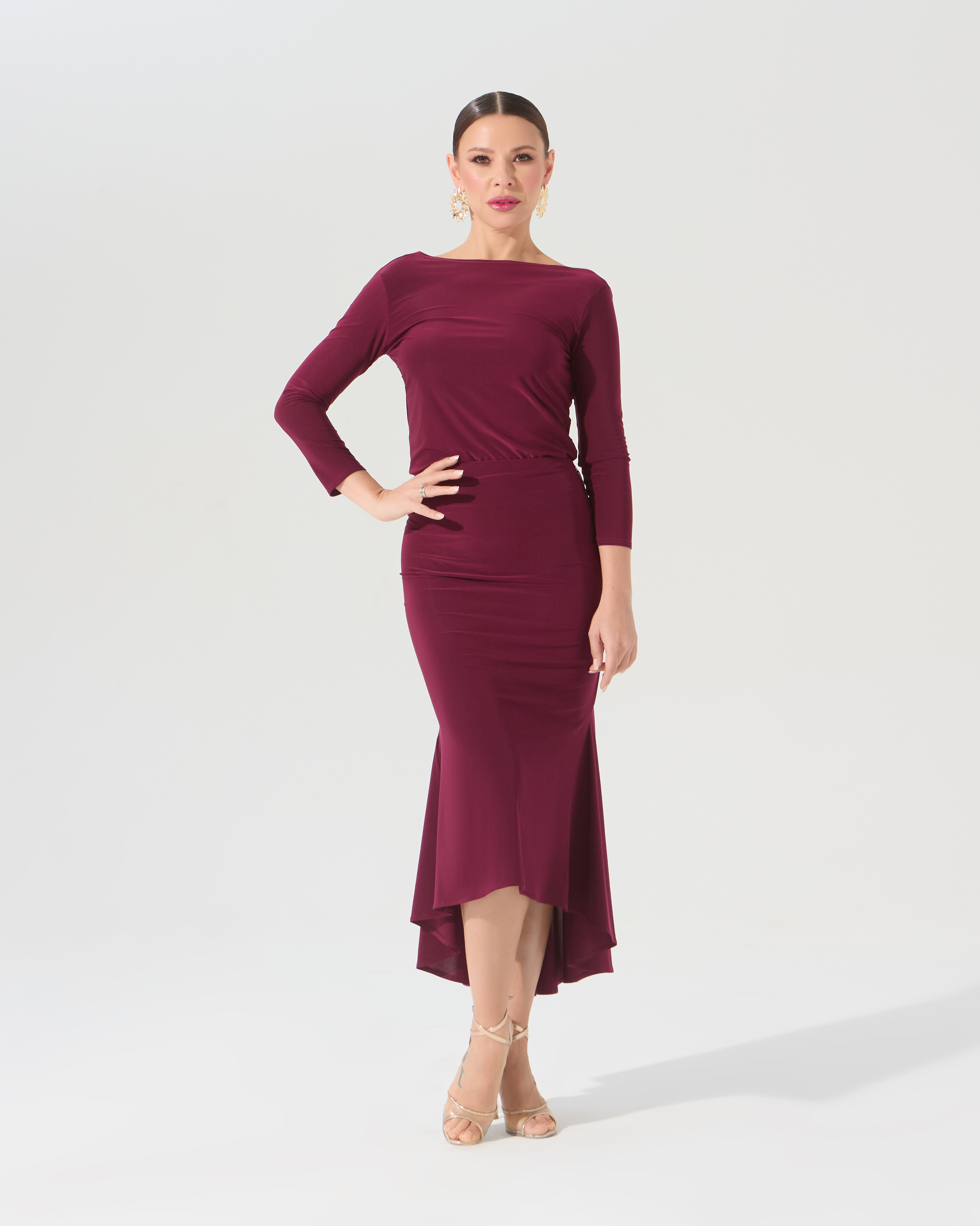 Юбка для танго с двумя большими клиньями и расширением по низу очень эффектна в движении. Идеально сочетается с любыми топами или боди из танго коллекции. В комплекте с боди такого же цвета комплект смотрится целостно как платье.