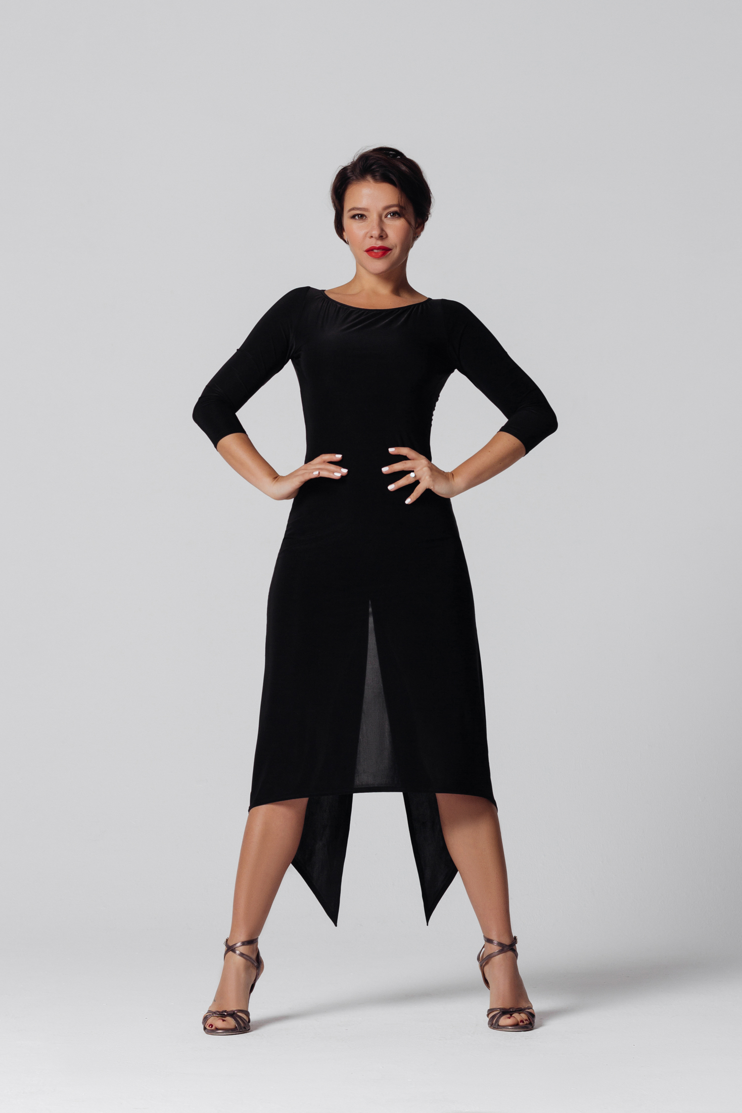 Аргентинское танго и открытая спина — такие же неразлучные понятия, как аргентинское танго и высокие разрезы. В этом платье соединилось все — красивые линии, удобный крой, вшитые шортики. Верх платья продуман так, что можно вложить и закрепить любые чашки.