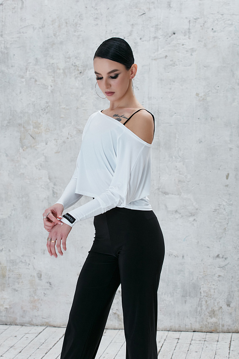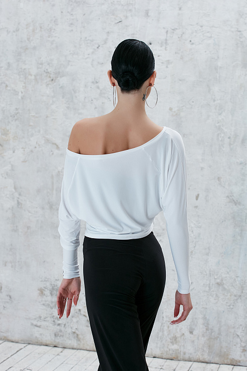 Укороченная блузка с рукавами «летучая мышь» — идеальный выбор для любительниц объемного верха и большой горловины, позволяющей открывать одно плечо. Рекомендуем надевать на любой топ на тонких бретелях.