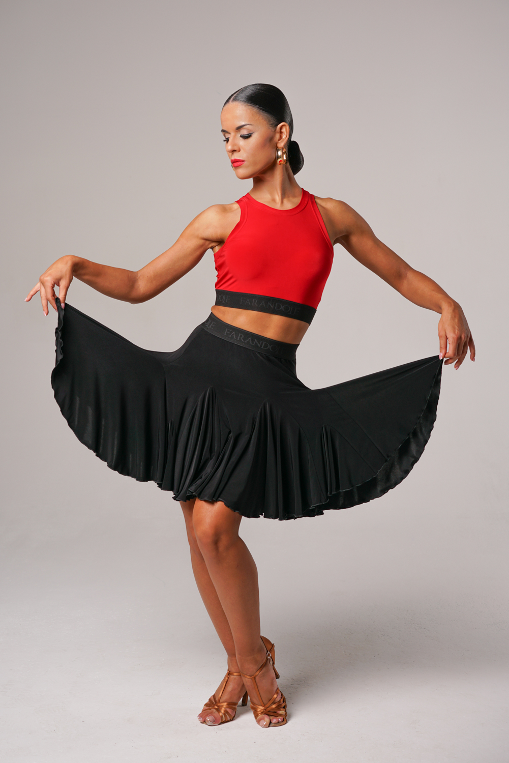 Мини юбка с клиньями "годе" разного уровня и размера создает в движении эффект раскрывшегося бутона цветка. Представлена в черном, красном однотонных вариантах, а также в классическом бежево-коричневом леопарде и оригинальном бело-черном леопарде. Эффектно сочетается с топами.