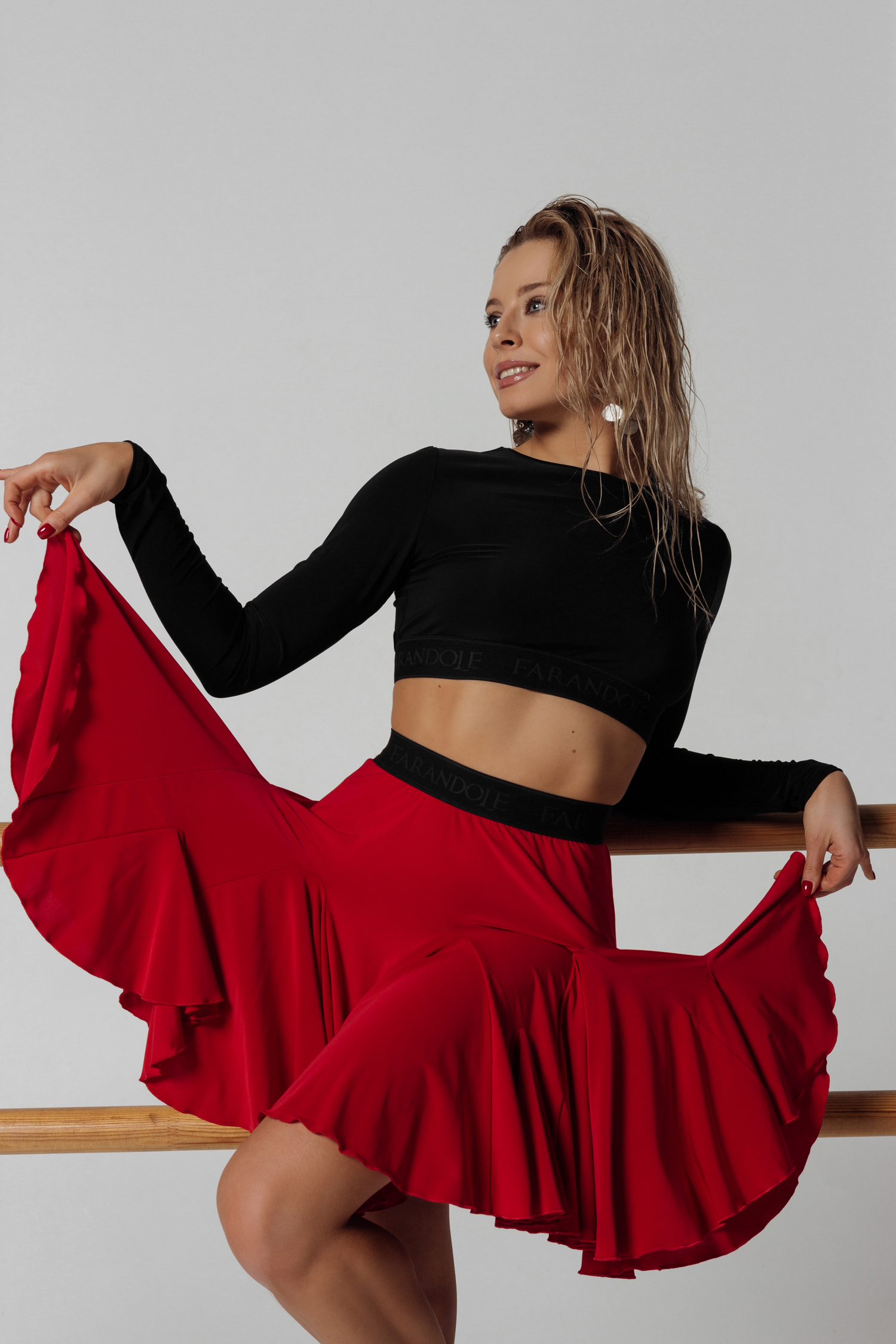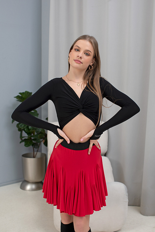 Мини юбка с клиньями "годе" красного цвета разного уровня и размера создает в движении эффект раскрывшегося бутона цветка. Представлена в черном, красном однотонных вариантах, а также в классическом бежево-коричневом леопарде и оригинальном бело-черном леопарде. Эффектно сочетается с топами.