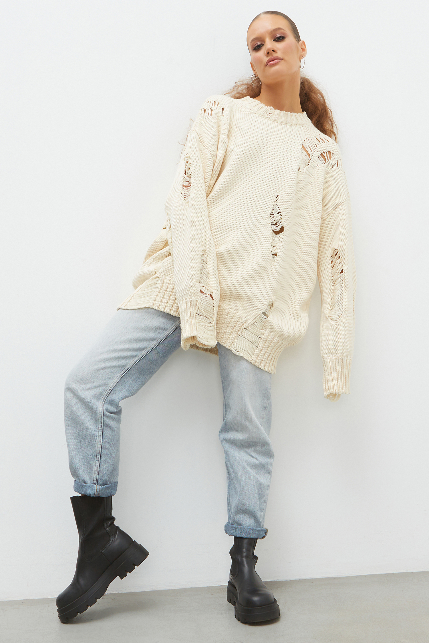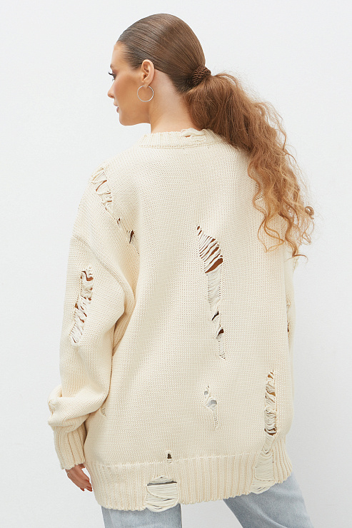 Трендовая модель этого сезона — стильный джемпер с дырками и большими протяжками — станет вашей любимой вещью вне сезона. Пряжа, в составе которой 50% хлопка и 50% акрила, очень приятная к телу как в холодное, так и в теплое время года. Сочетайте джемпер с джинсами, легинсами, кожаными брюками или юбками, а также с короткими или длинными шортами.