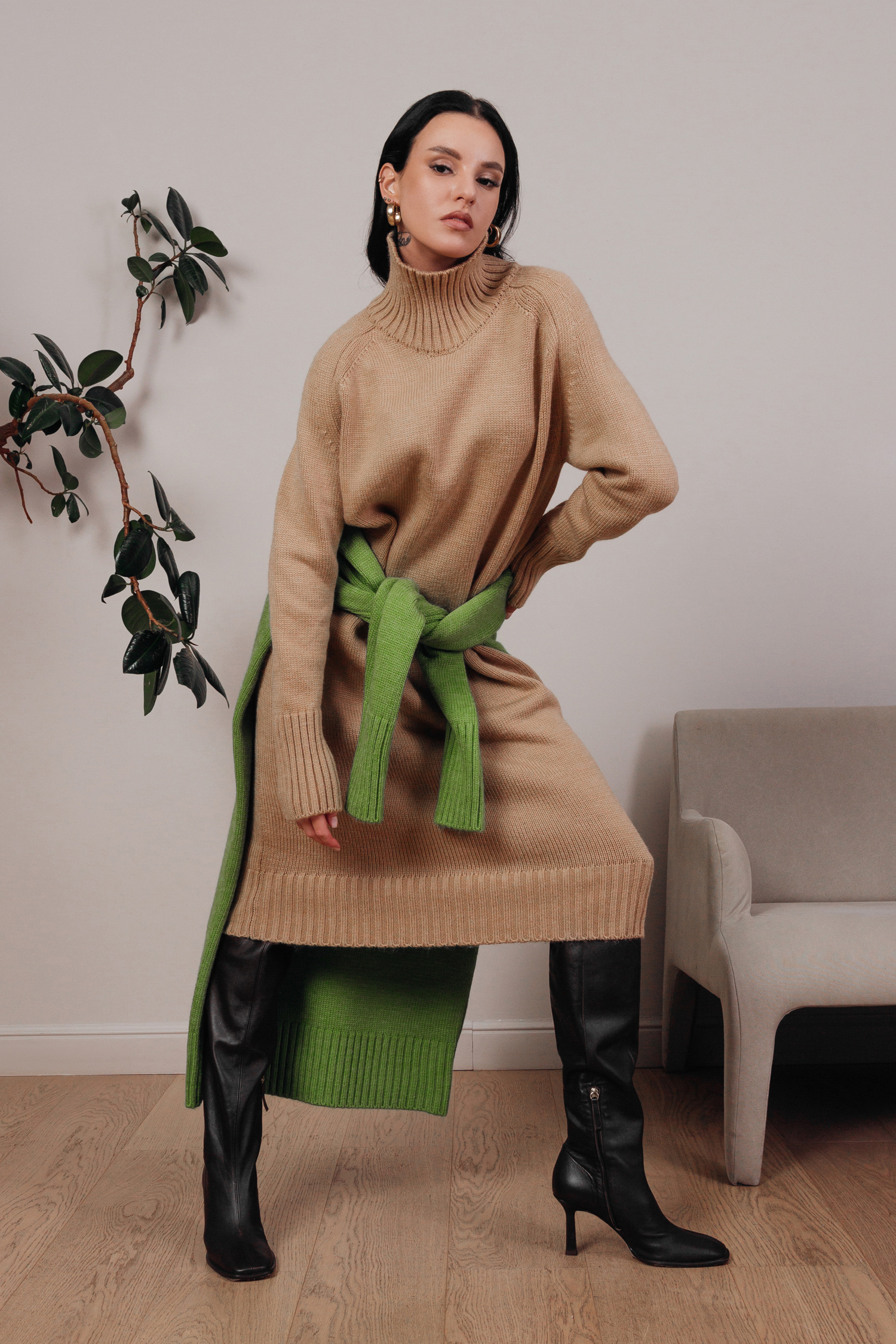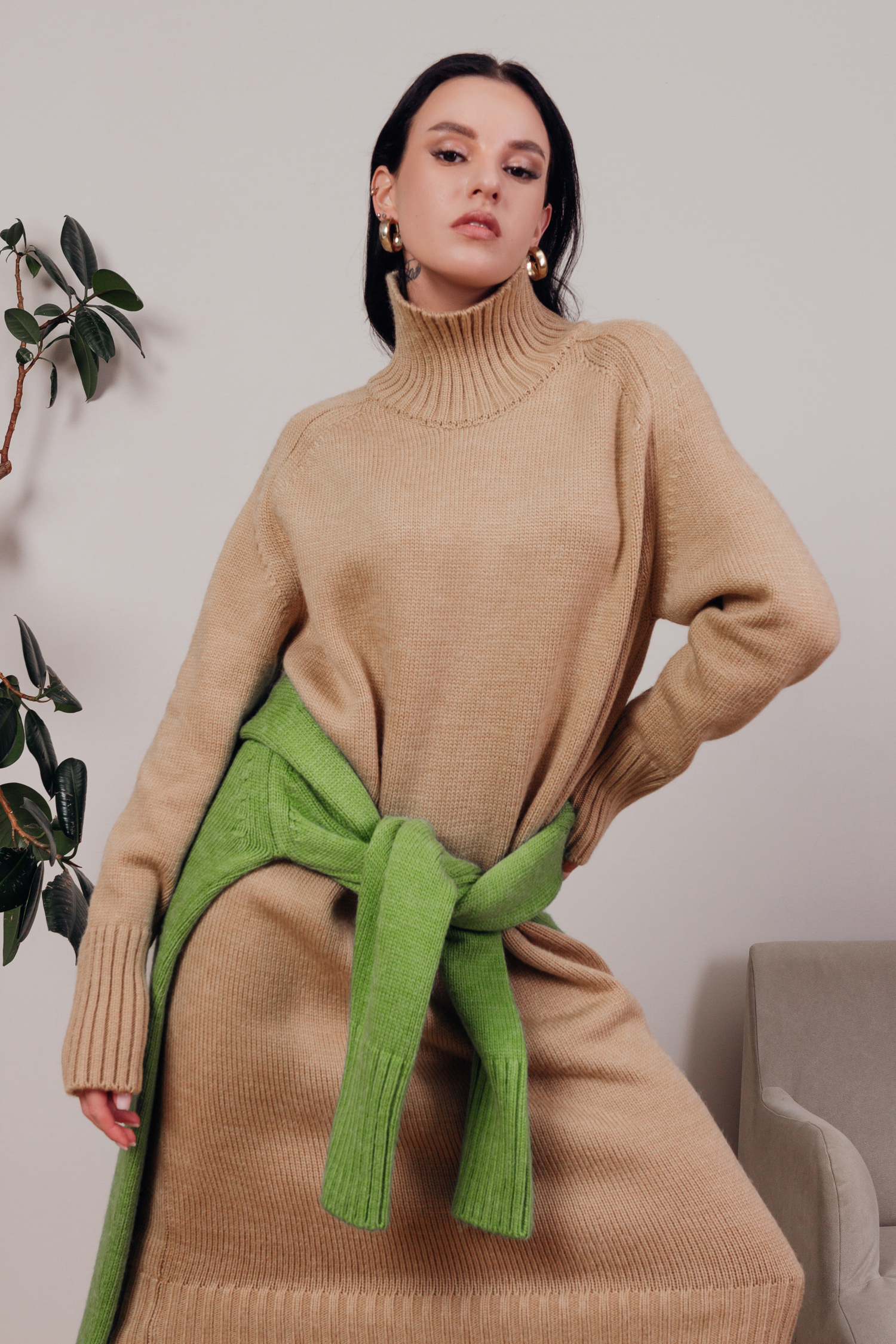 Очень уютное, теплое, стильное и комфортное платье, которое согреет вас в холодное время года. Мягчайшая пряжа, стильный крой, актуальная длина до середины икры. Высокий ворот выручит в холодную погоду и заменит вам шарф. Платье выполнено в пастельных оттенках — молочный, светло-серый, бежевый и небесный. Но мы добавили акцентный и актуальный в этом сезоне цвет зеленого яблока, идеально сочетающийся с бежево-коричневыми аксессуарами.