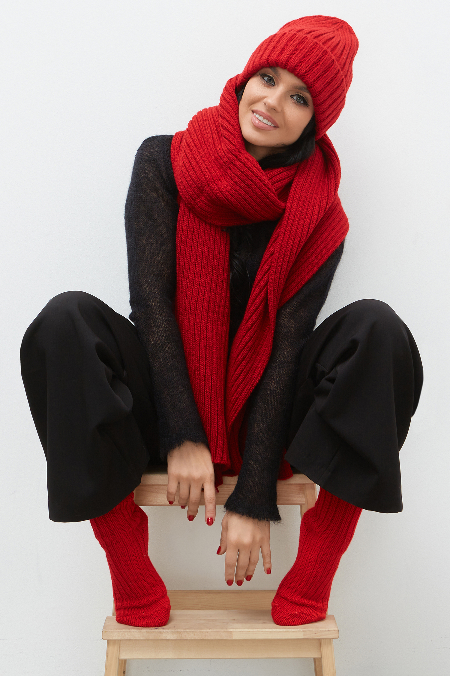 Шапка из мягкой согревающей пряжи объемной вязки с широким отворотом.