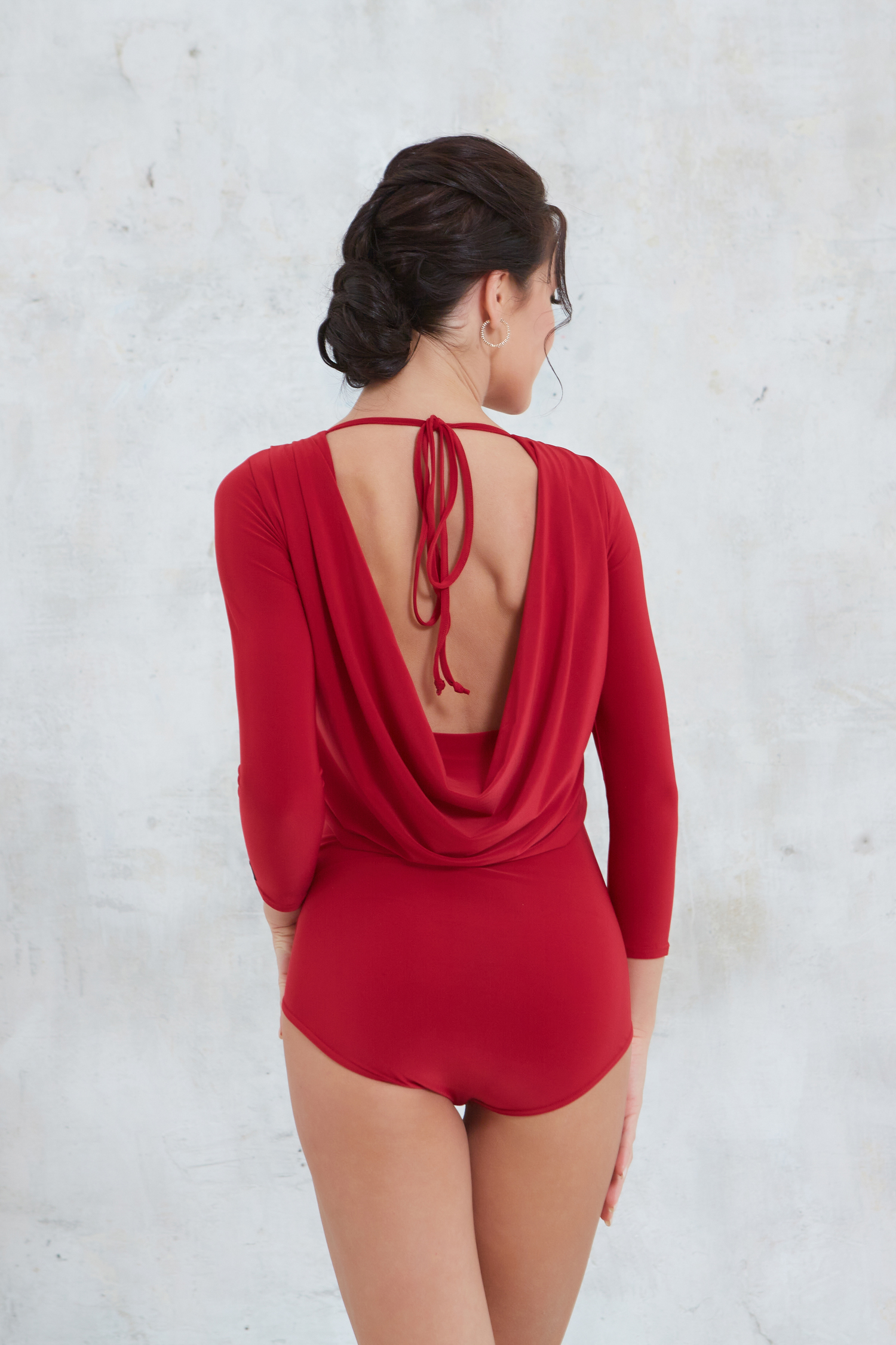 Прием «качели» на спине всегда был классикой в костюмах для европейской программы бальных танцев. Мы адаптировали эту модель для боди, сделав ее с максимально комфортной посадкой.