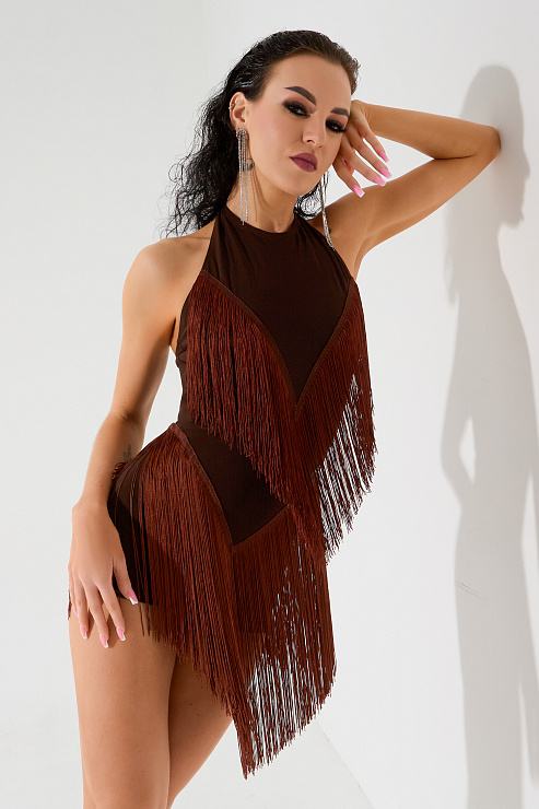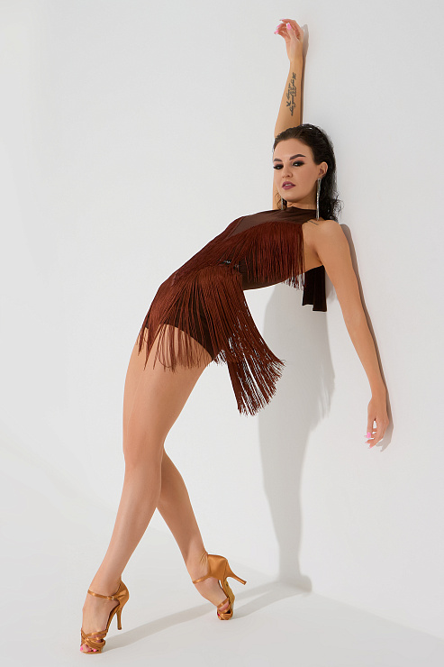 Платье с бахромой по диагонали и шортами от бренда танцевальной одежды FARANDOLE — эффектная и стильная модель. Платье выполнено на основе боди с шортами для вашего комфорта.