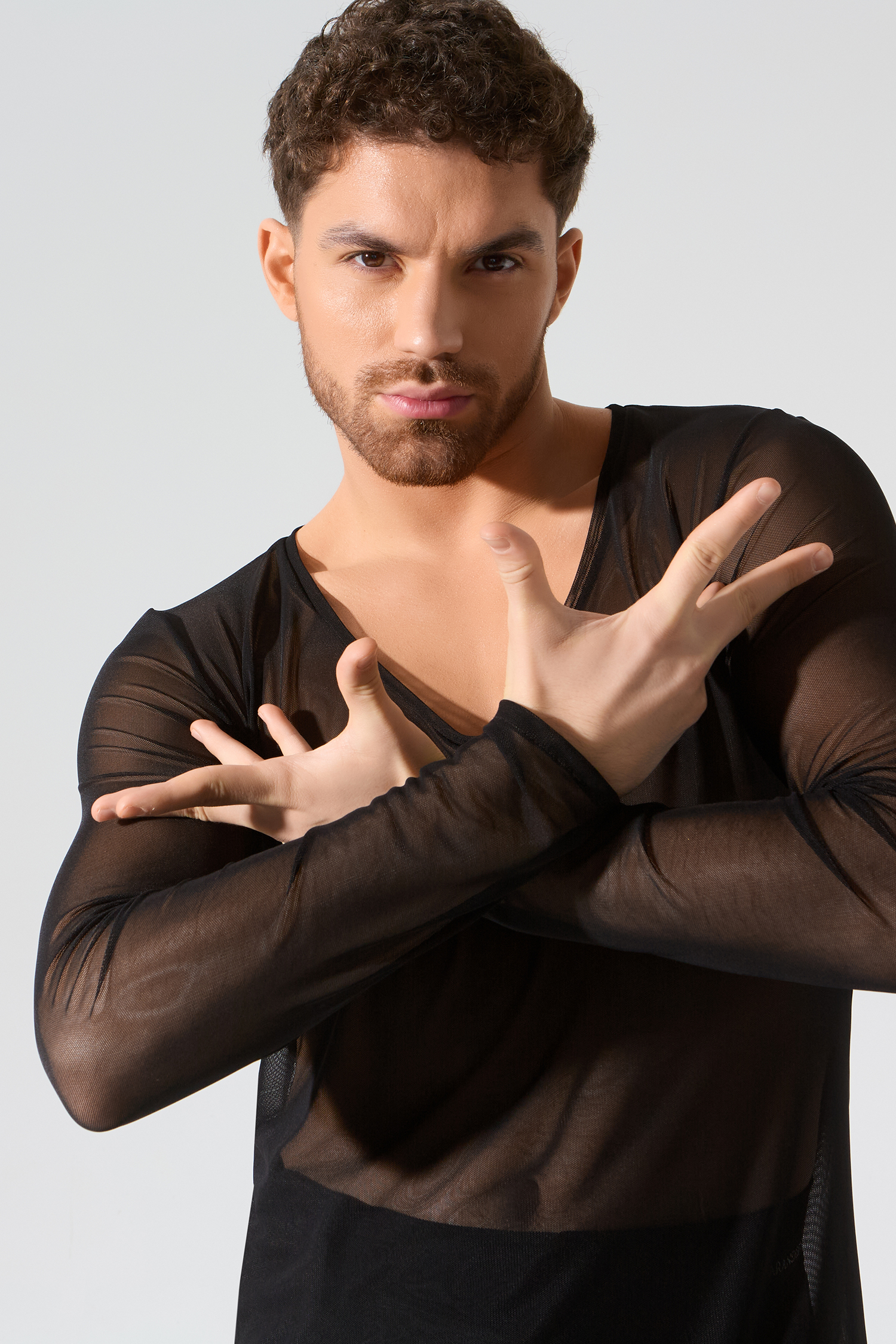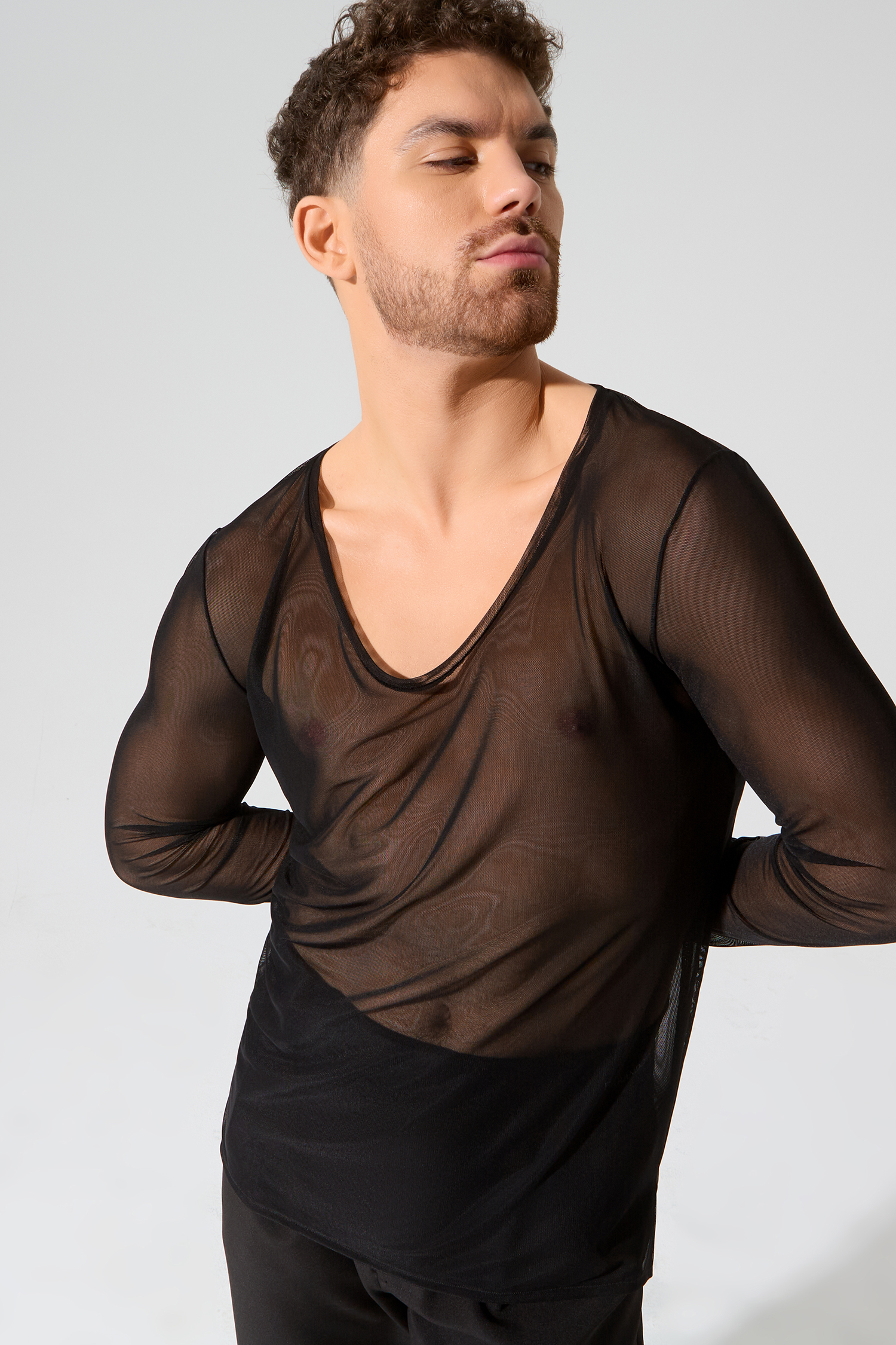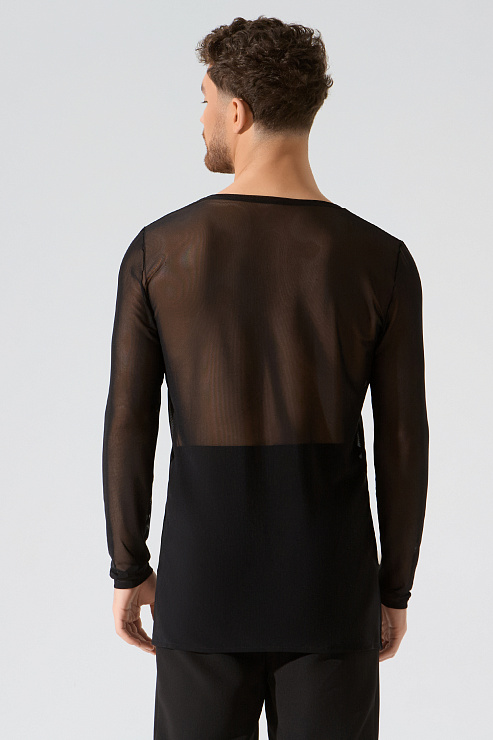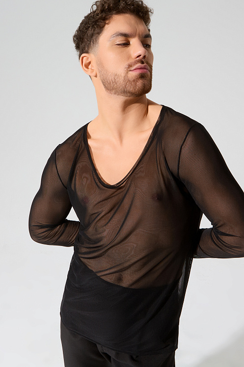Мужской лонгслив из сетки-стрейч и с глубоким вырезом от бренда танцевальной одежды FARANDOLE — стильная модель для латиноамериканских танцев. Сочетайте лонгслив с любыми брюками из мужской коллекции. В коллекции CHARISMA лонгслив представлен в черном цвете.