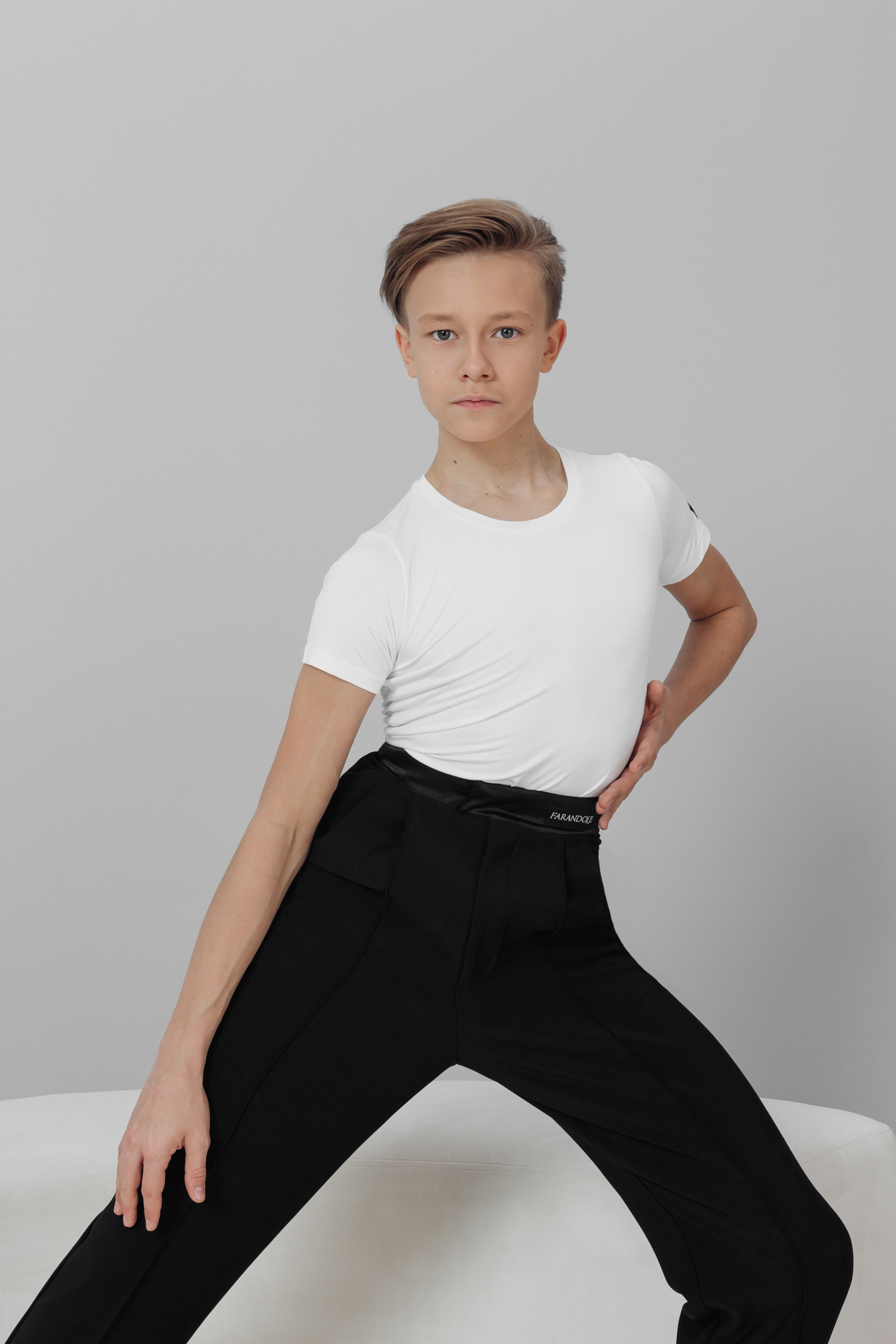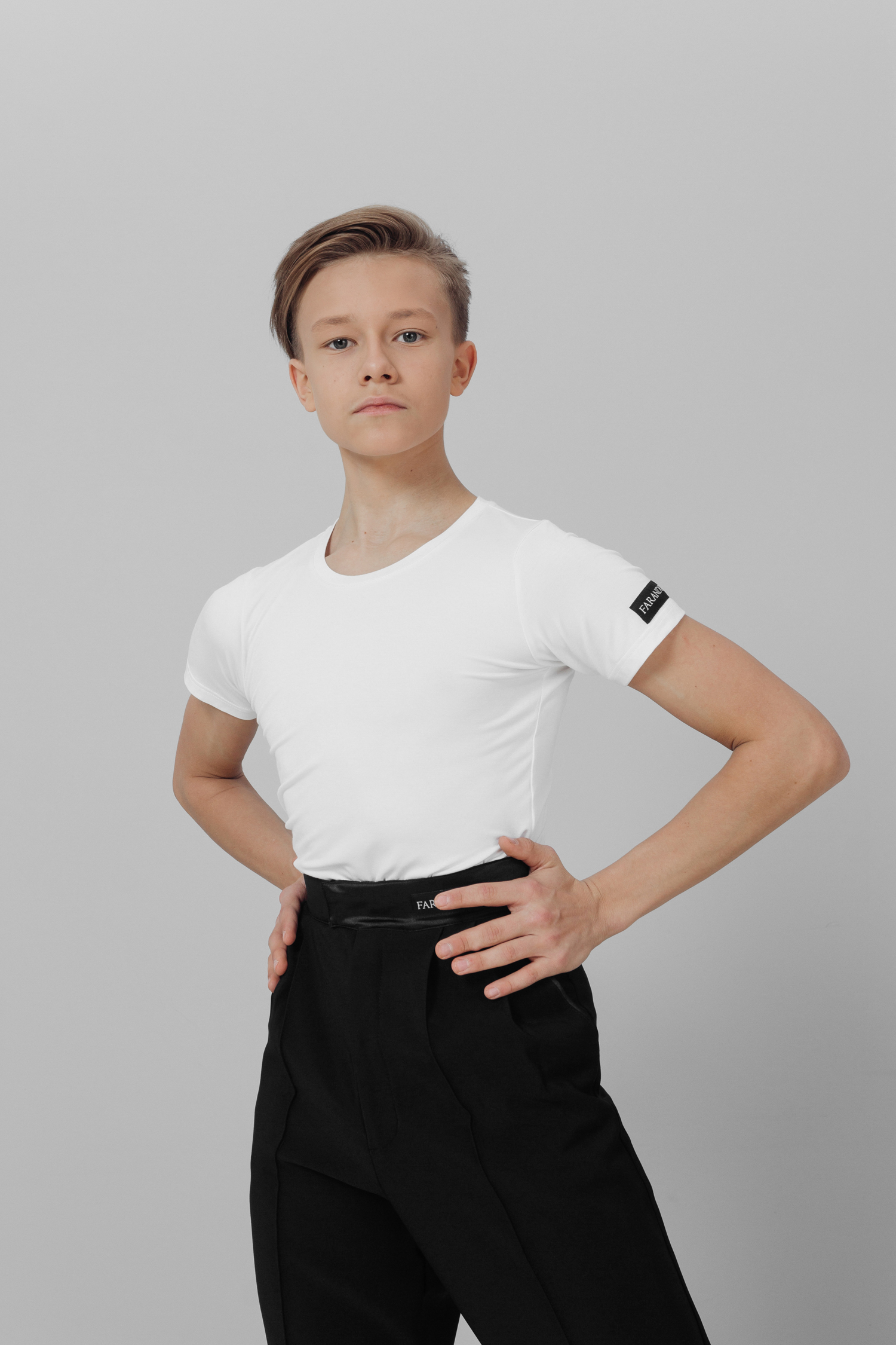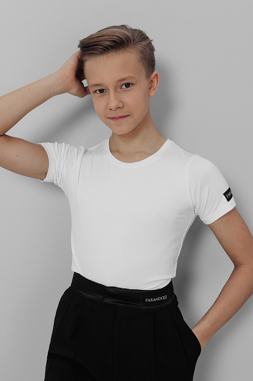 Футболка облагающего и приталенного силуэта с круглым вырезом выглядит очень  элегантно и прекрасно садится по фигуре, подчеркивая линии и движения во время танца. Футболка бренда FARANDOLE выполнена из трикотажного полотна "бамбук" — дышащий материал позволит чувствовать себя комфортно даже на самых интенсивных тренировках. Состав: 94% Бамбук, 6% Лайкра.