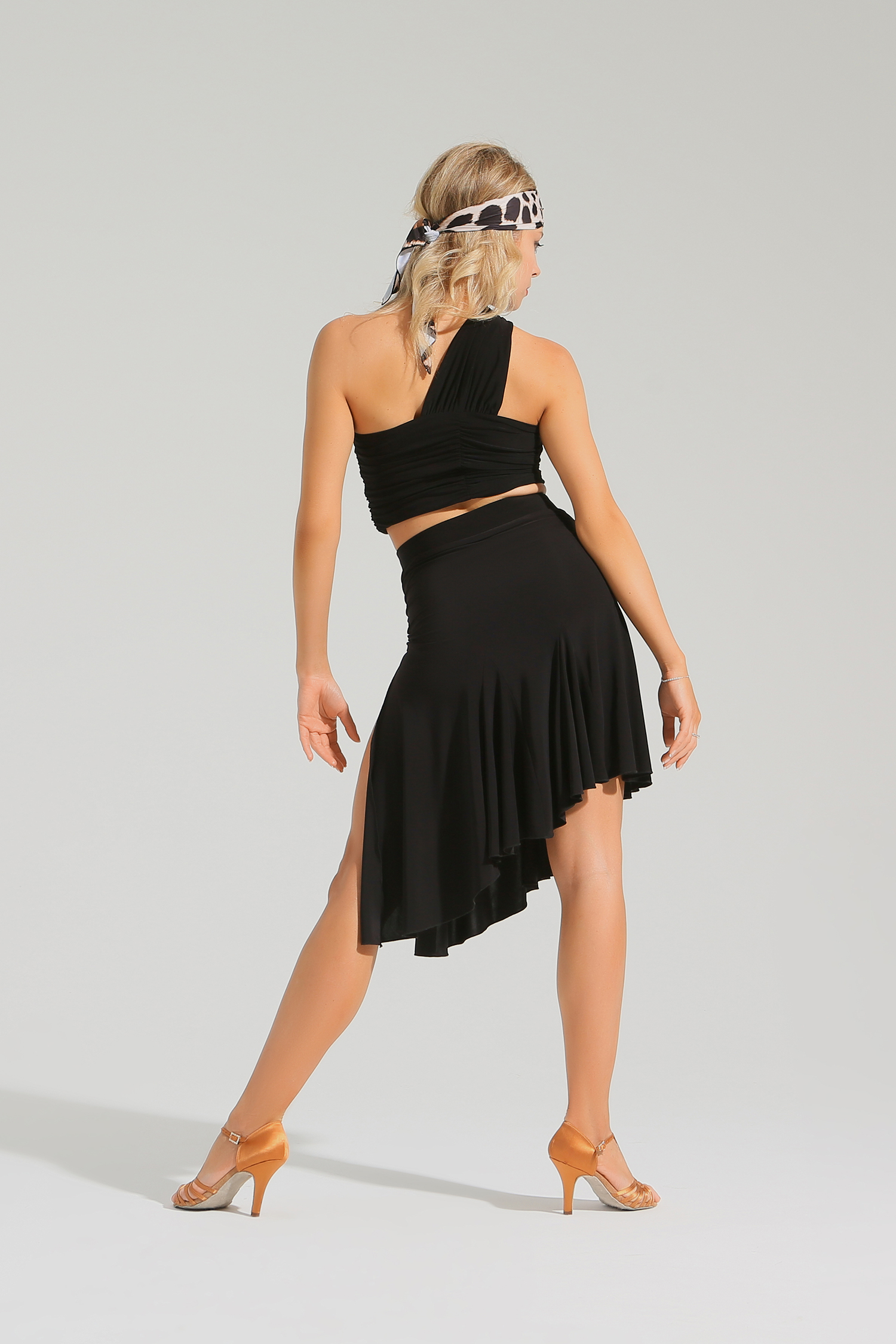 Базовая модель танцевальной юбки для любительниц длины «миди», но с красивым акцентным разрезом на ноге.