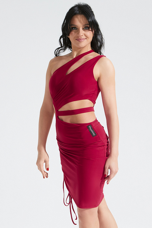 Платье мини на одно плечо с кулиской для латины от бренда FARANDOLE — сочетание провокационных открытых элементов и грациозности. Крой платья продуман для подчеркивания красивых изгибов женской танцевальной фигуры. Особые акценты — асимметрия на одном плече и юбка с кулиской на одном боку, позволяющаа регулировать длину платья. Специальный элемент в виде пришитого пояса подчеркивает талию.