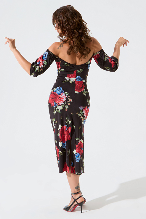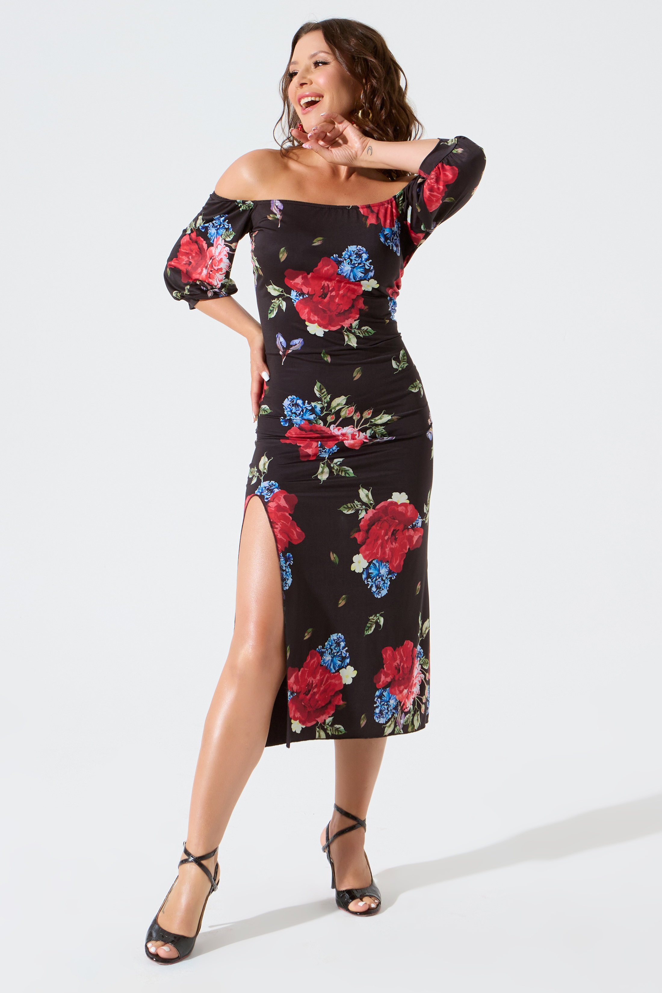 Платье с рукавами «фонарик» от бренда FARANDOLE — женственная модель для аргентинского танго, открывающая красивые плечи.