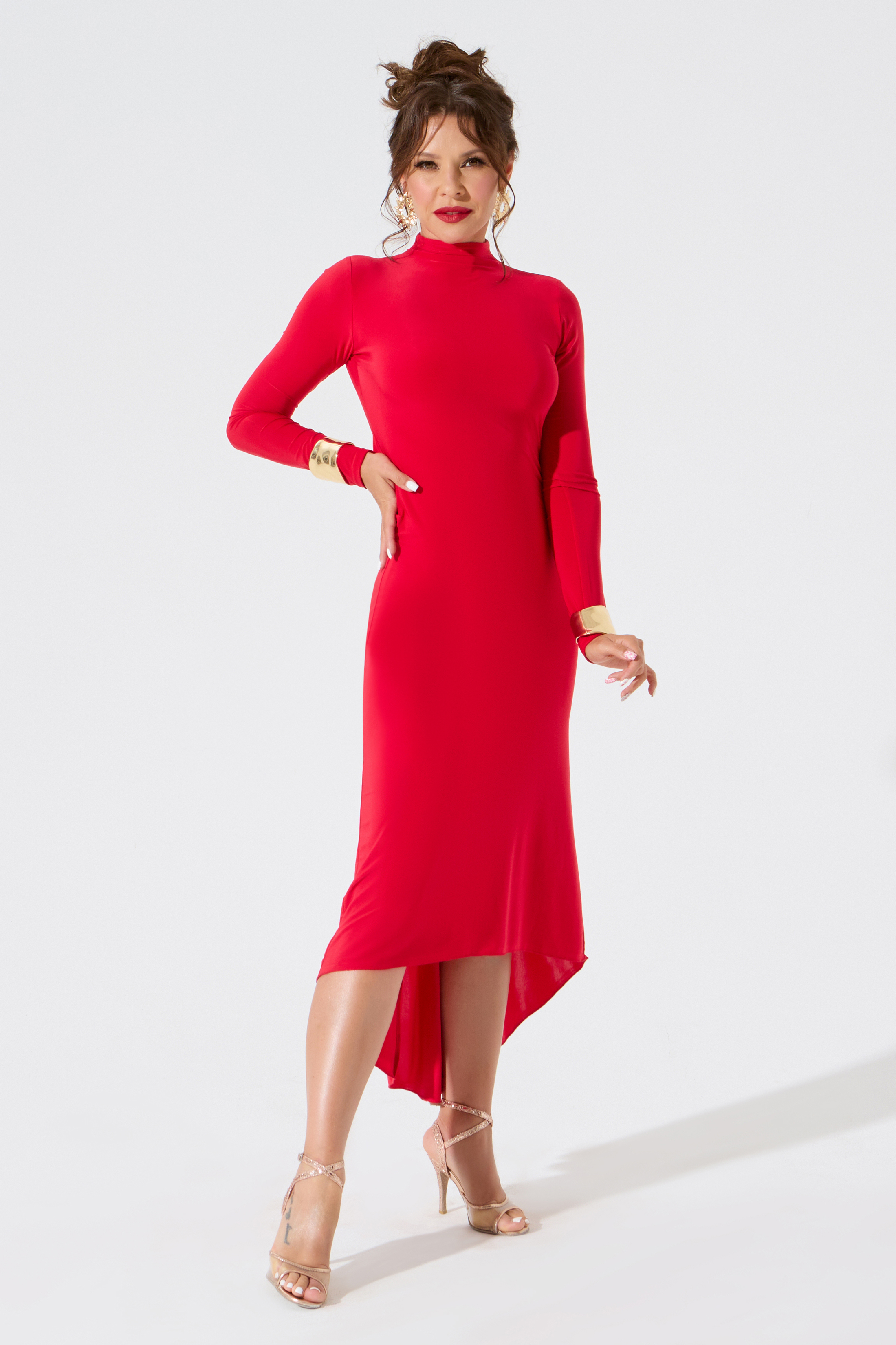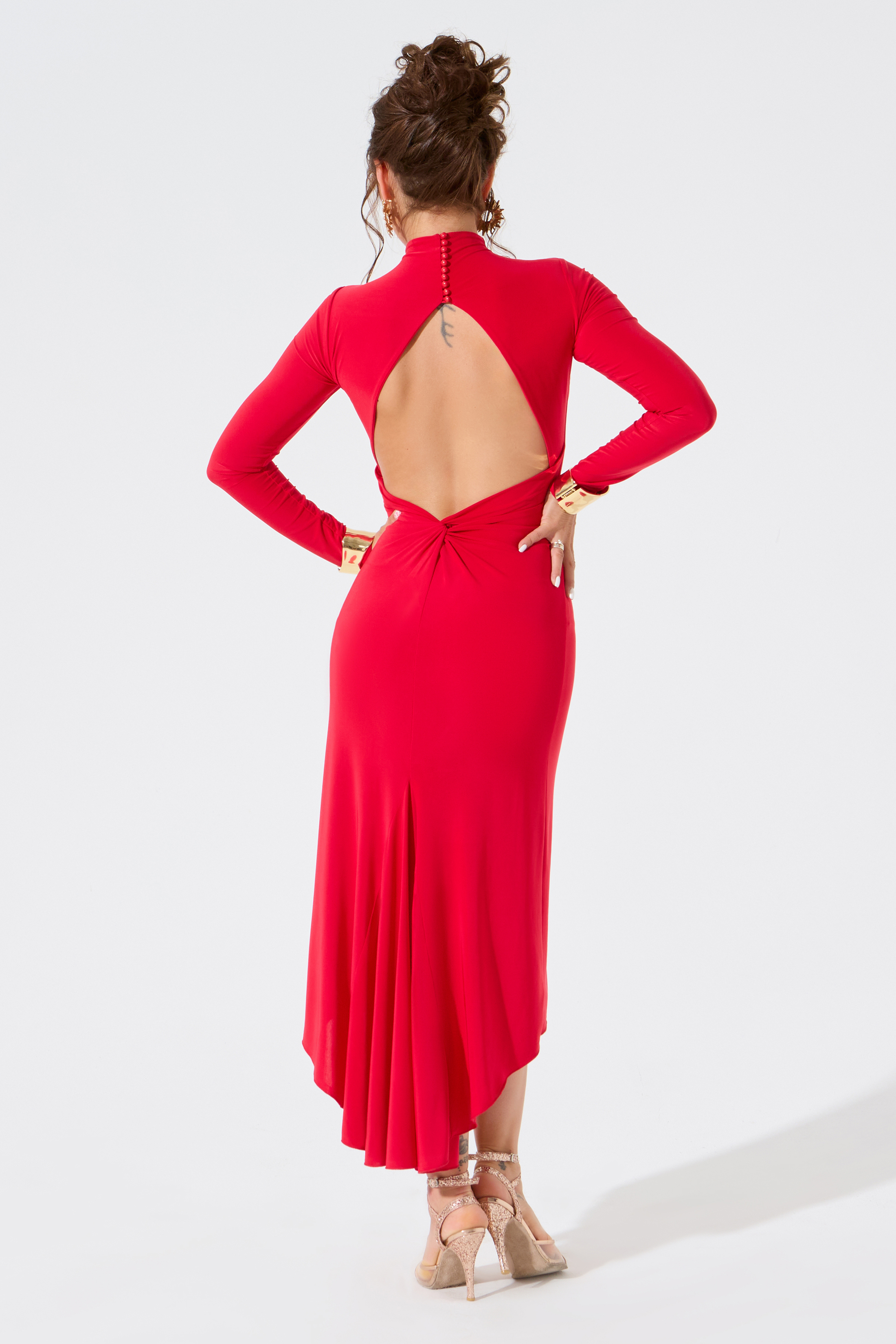 Платье со стойкой и узлом от бренда FARANDOLE — изысканные линии и очень женственный силуэт для танца аргентинское танго. Спереди платье закрыто благодаря длинным рукавам и воротнику-стойке, а спина красиво открыта с акцентным узлом и стойкой на эффектных пуговицах на ножке.