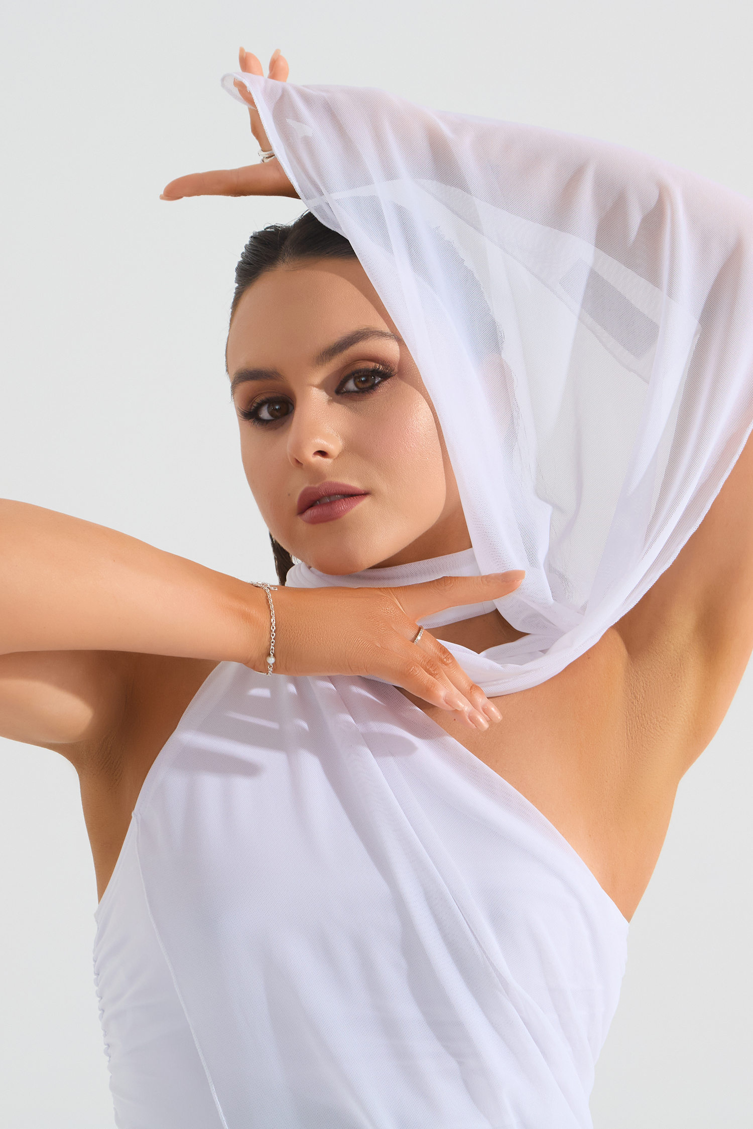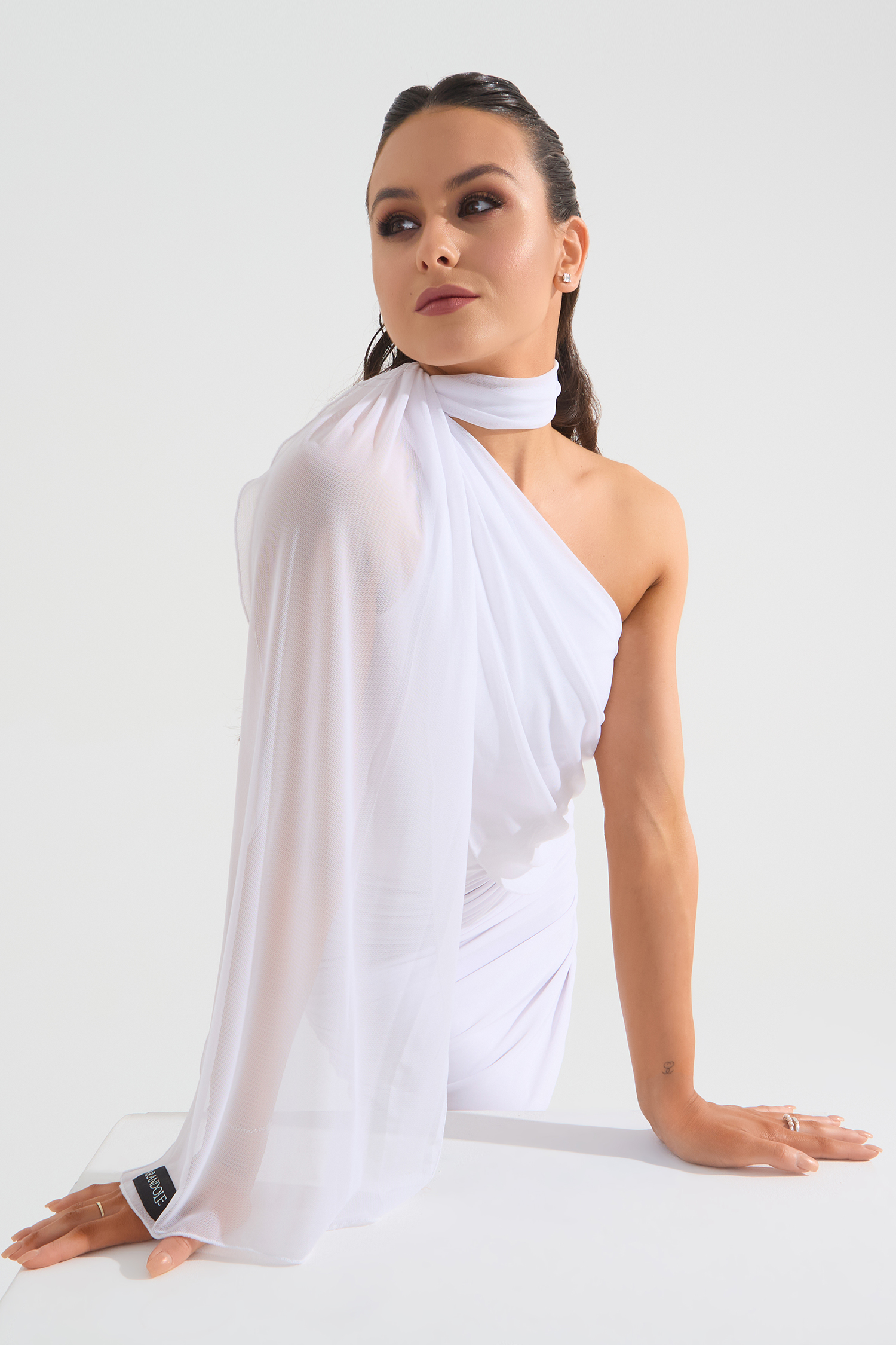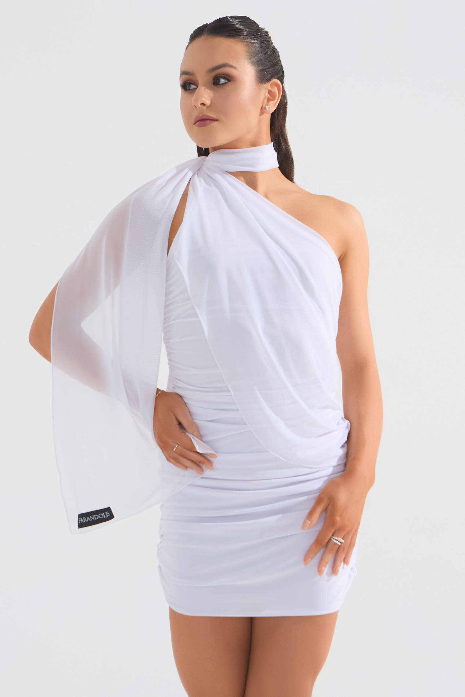 Платье мини со сборкой и летящим шарфом из сетки от бренда FARANDOLE — универсальная модель как для танцев, так и для повседневной жизни. Мягкий трикотаж очень приятен к телу, декоративная отделка из сетки и шарф — трендово, стильно и эффектно подчеркивают фигуру. В коллекции BLACK&WHITE платье представлено в черном и белом цвете.
