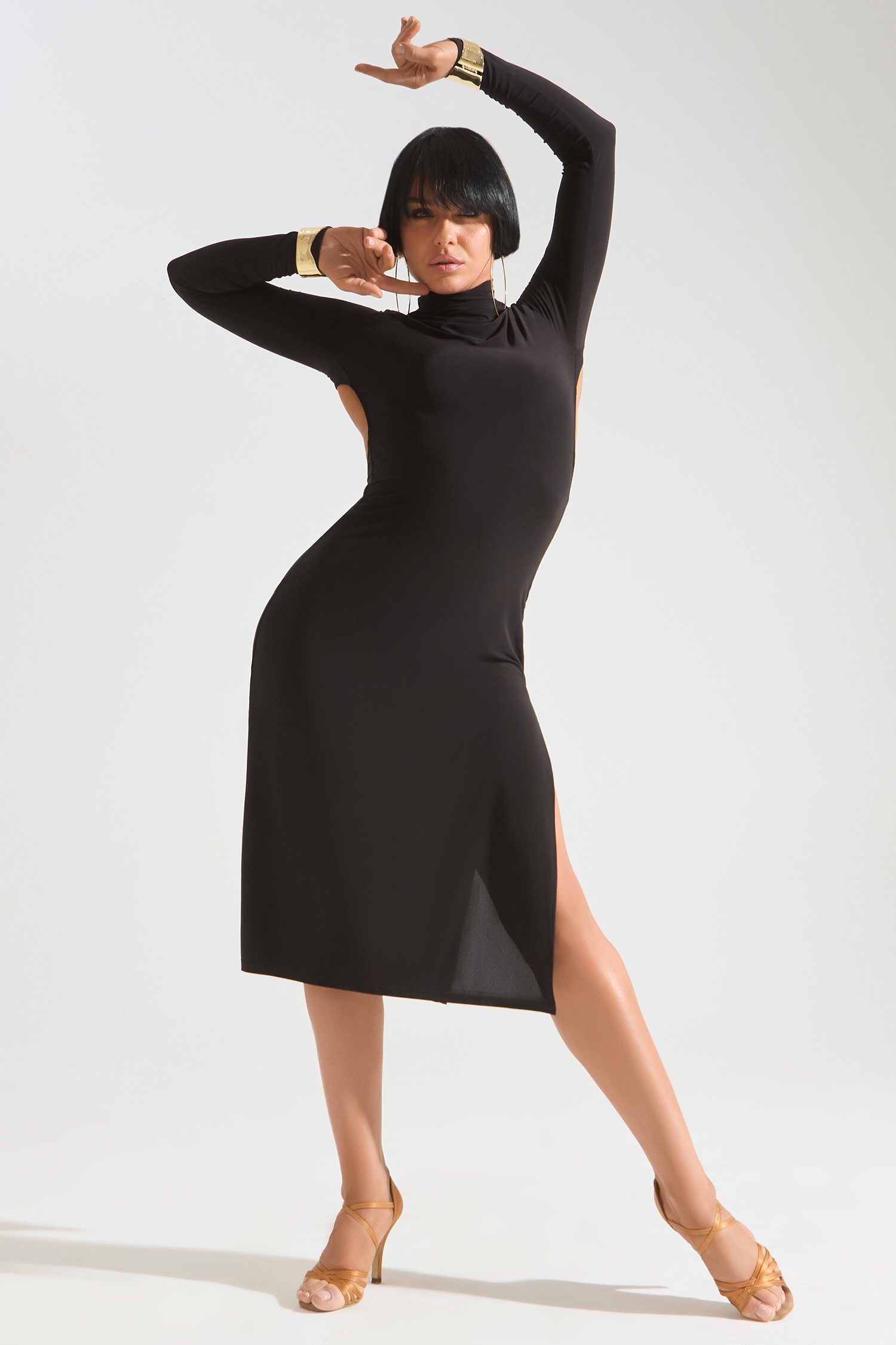 Платье миди с эффектной открытой спиной, воротником-стойкой и большим разрезом — шикарная элегантная и женственная модель. Идеальный выбор не только для танцев, но и как вечерний образ.