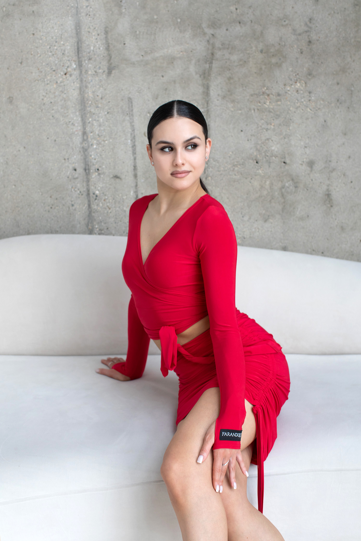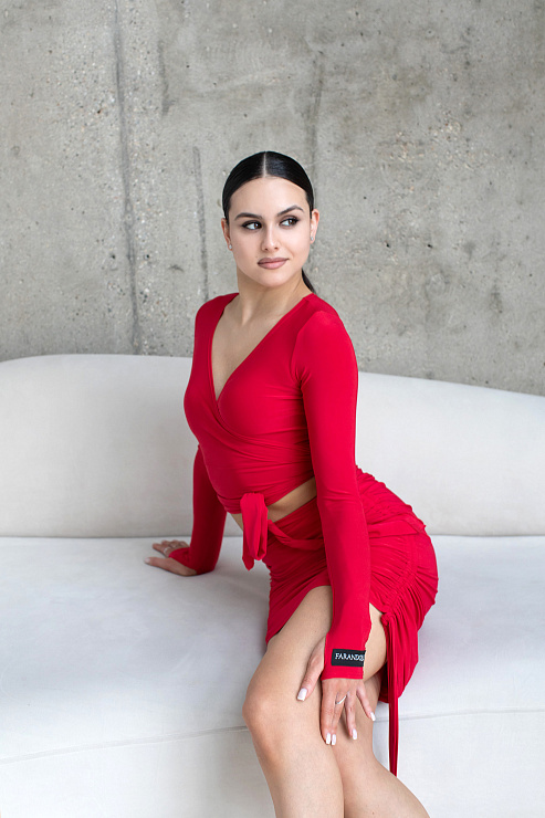 Укороченная блузка на запах от бренда FARANDOLE — универсальная модель как для танцев, так и для повседневной жизни и занятий йогой. Конструкция топа не предусматривает чашки, топ на запах идеально садится на нижнее белье.