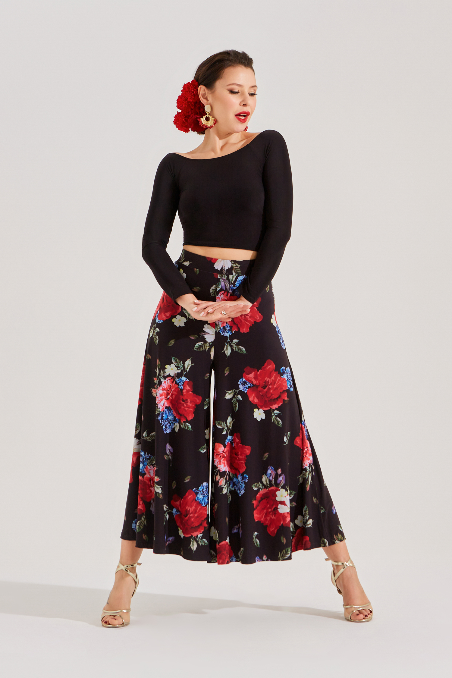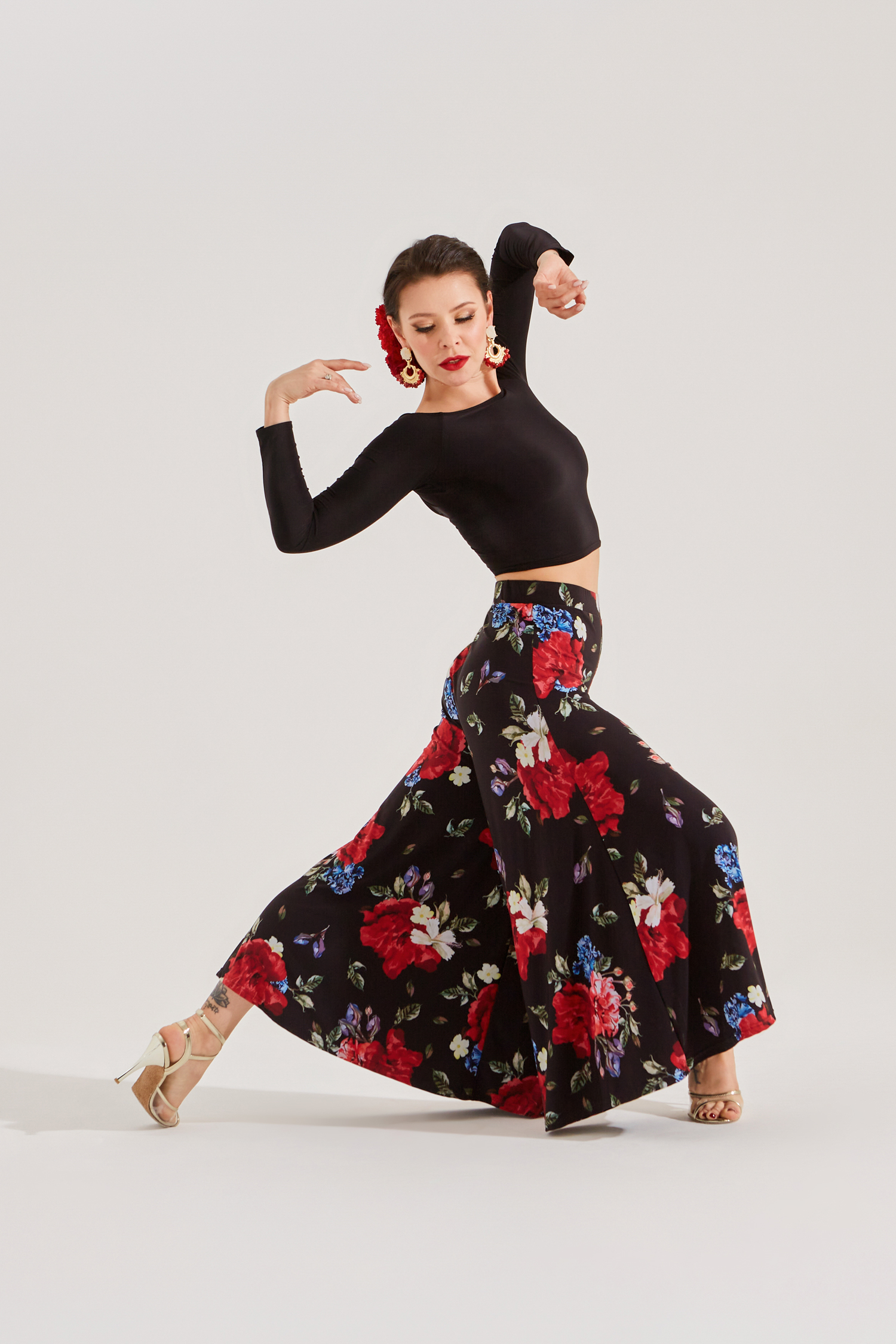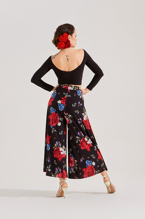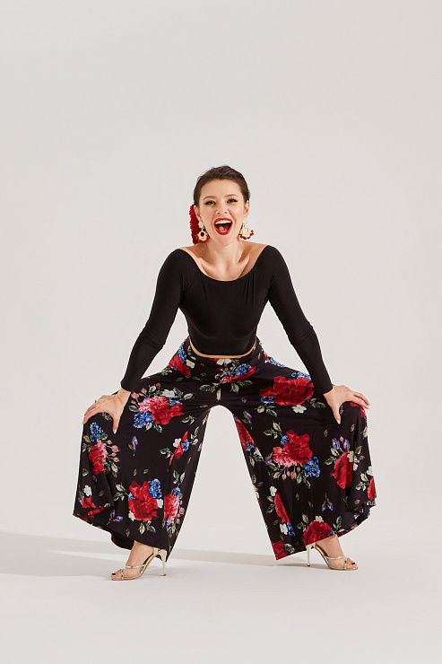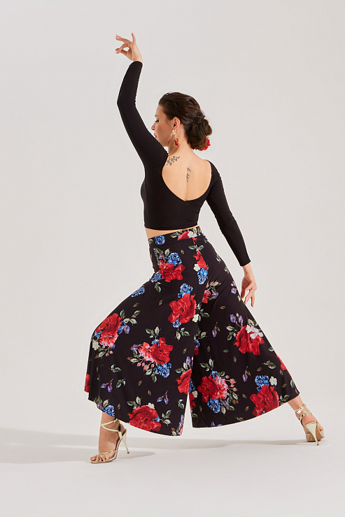 Юбка-брюки — очень стильная и комфортная модель для тренировок. Ширина брючин дает ощущение легкости и женственности, как в юбке, но в то же время брюки дают больше свободы в движениях в танце. В авторском цветочном принте юбка-брюки особенно эффектны.