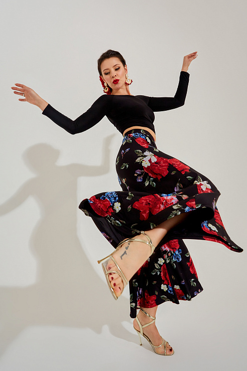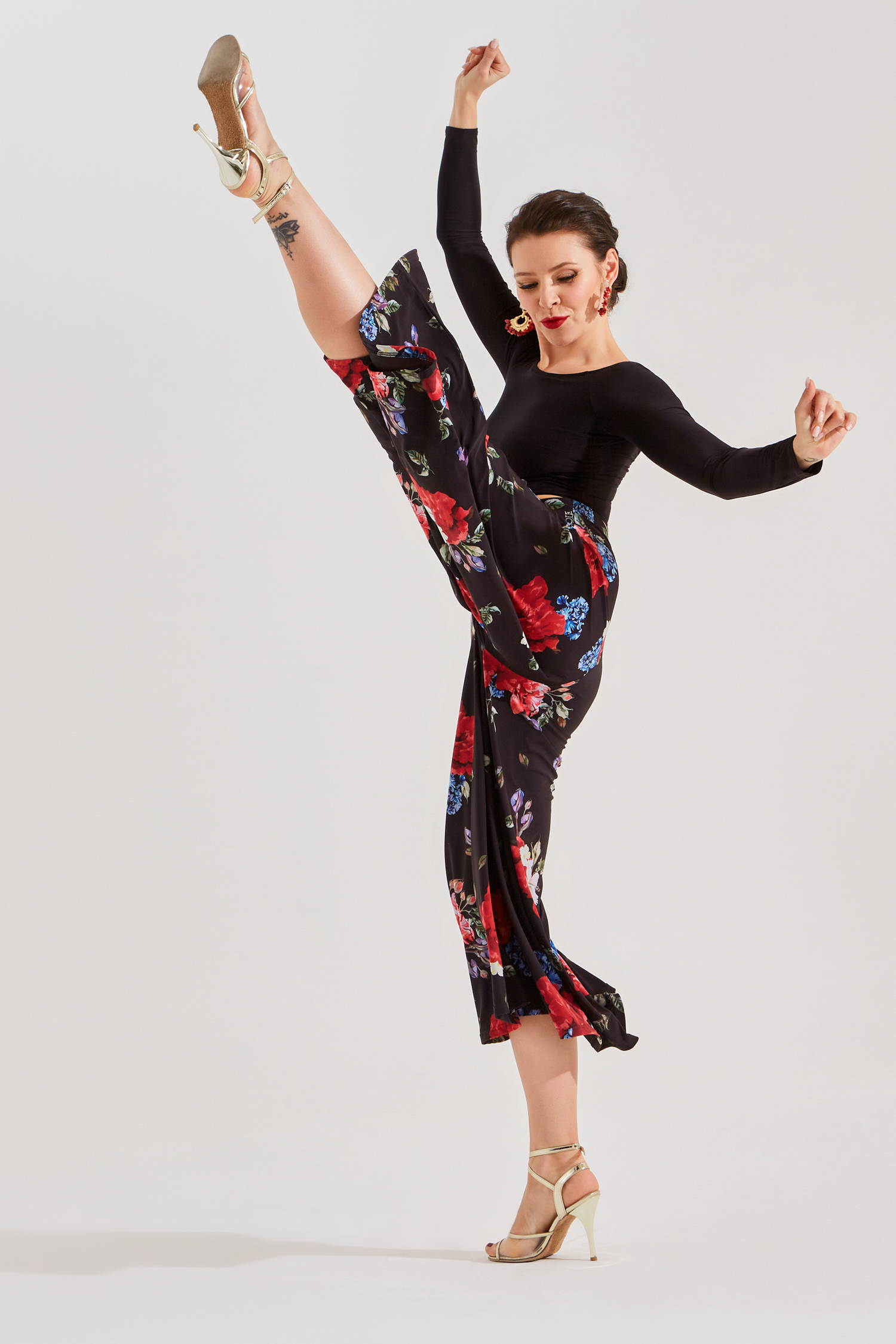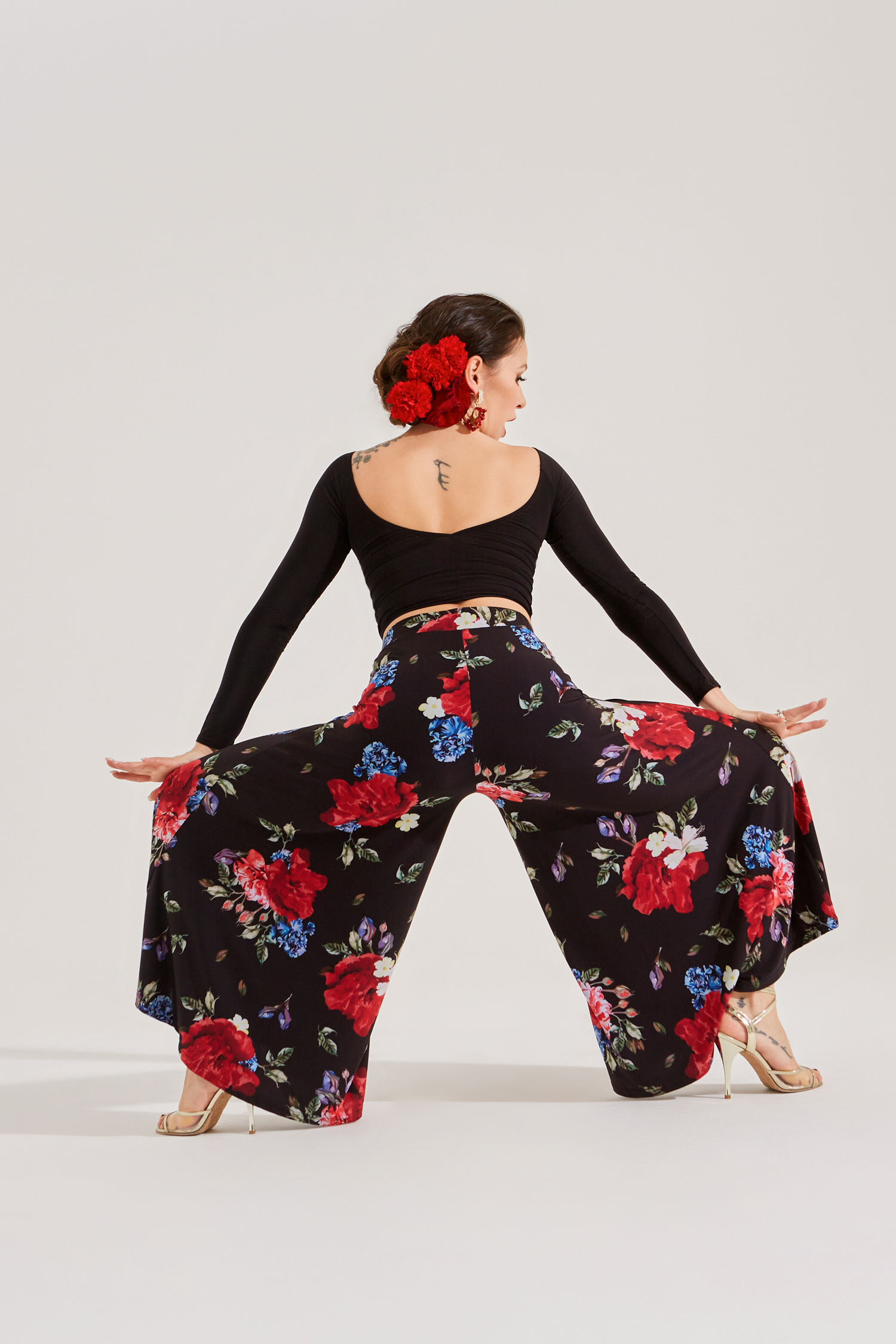 Юбка-брюки — очень стильная и комфортная модель для тренировок. Ширина брючин дает ощущение легкости и женственности, как в юбке, но в то же время брюки дают больше свободы в движениях в танце. В авторском цветочном принте юбка-брюки особенно эффектны.