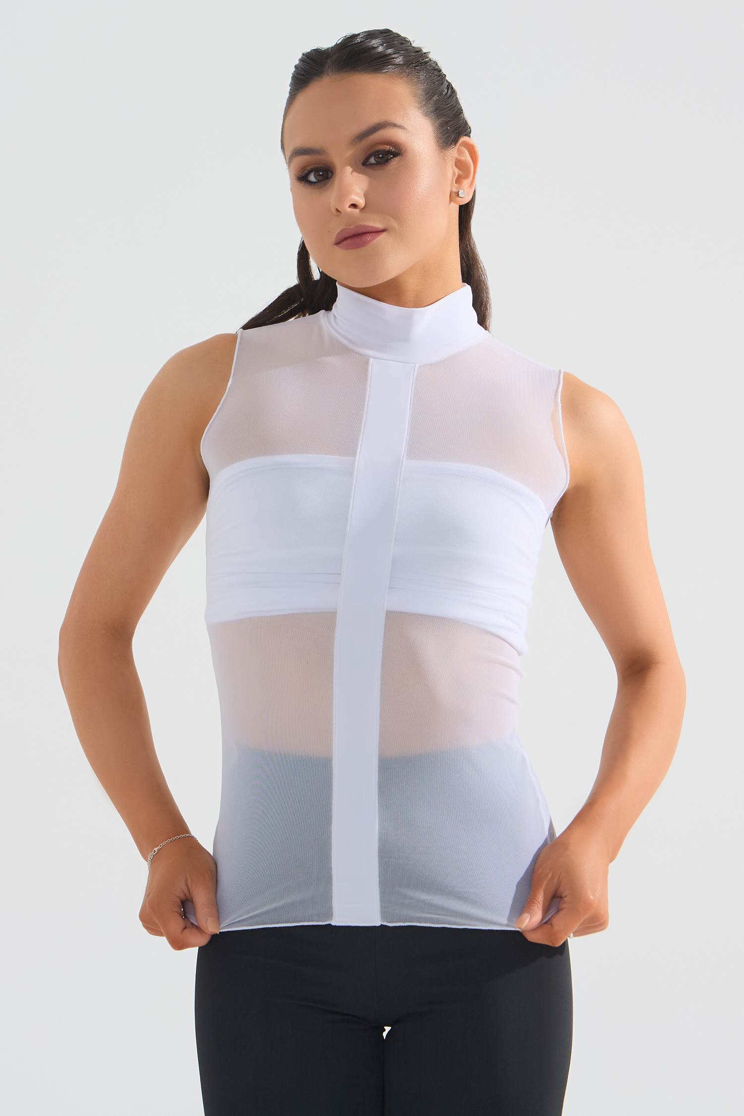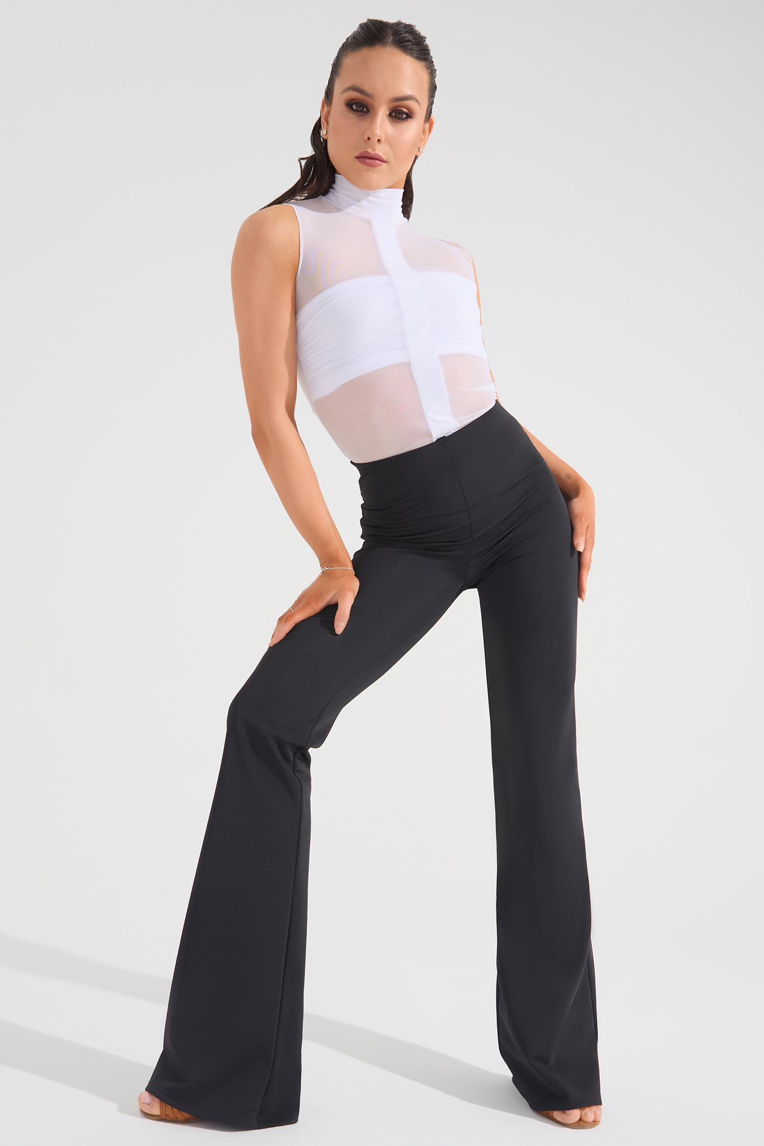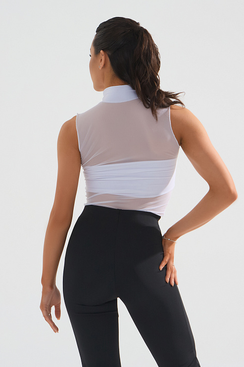 Блузка с полоской и стойкой от бренда одежды для танцев FARANDOLE — стильная и футуристичная модель. Особенно красиво сочетается с брюками-клеш.