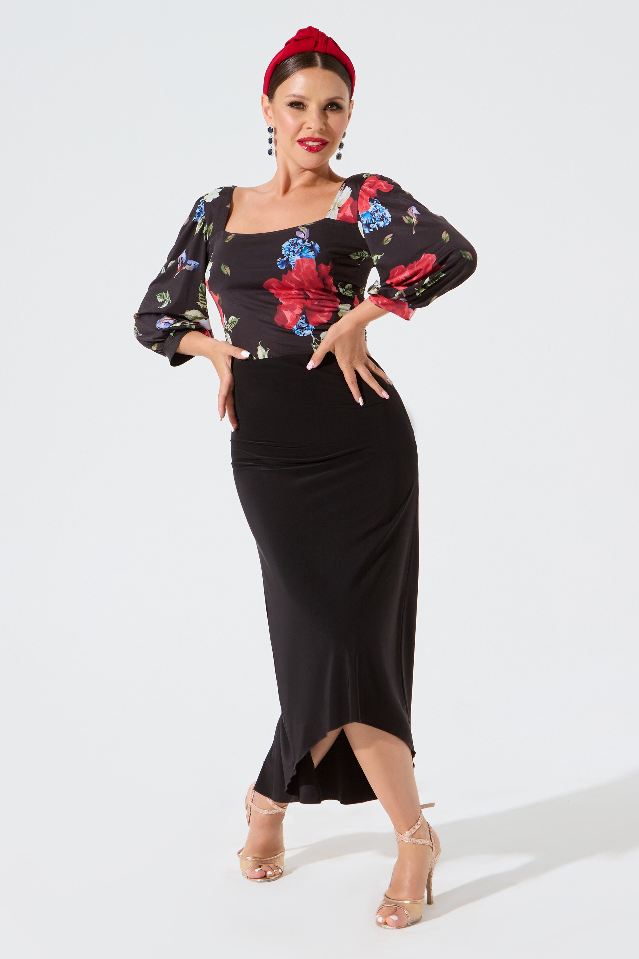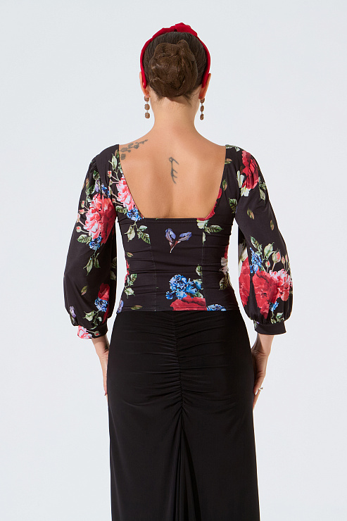 Блузка от бренда танцевальной одежды FARANDOLE с эффектными рукавами «фонарик» и вырезом «каре» — универсальная модель для любого вида танца и для повседневных образов.