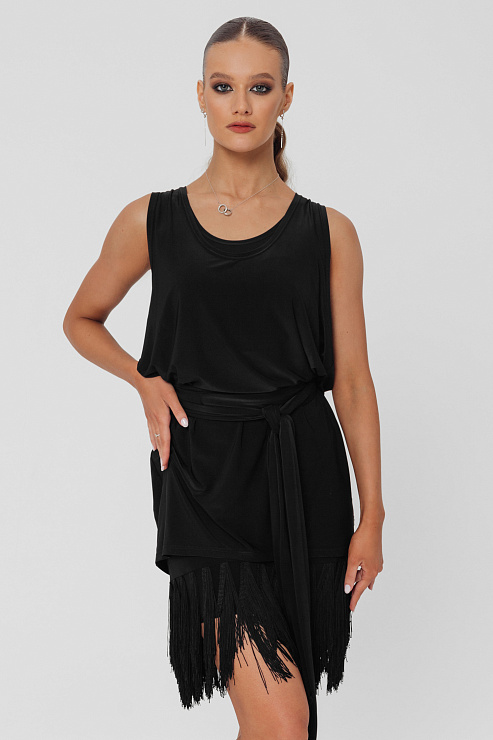 Мы рекомендуем надевать под майку-тунику укороченный топ и сверху широкий пояс с бахромой на концах.