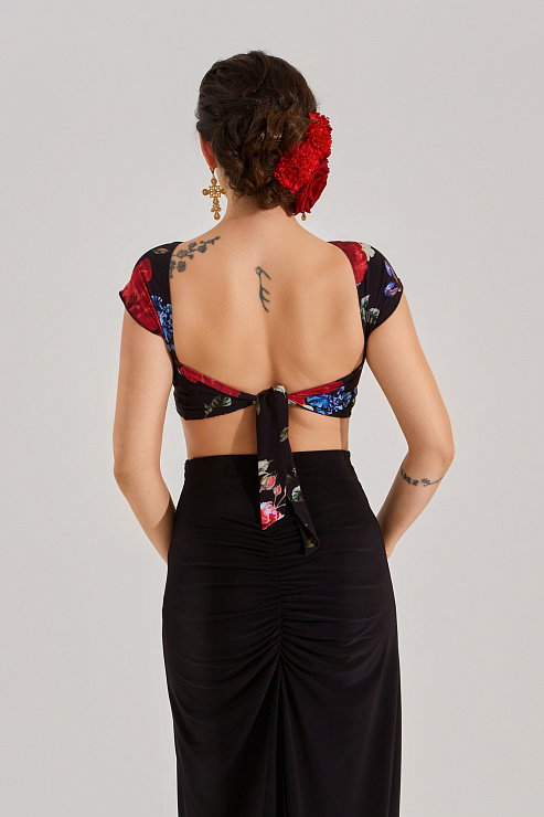 Топ с завязкой на спине, эстетично открывающий спину, имеет очень красивую линию «лодочки» на горловине, переходящую в рукав. Топ прекрасно подойдет для танго, латины, стандарты или повседневного образа летом. В авторском принте модель особенно ярко и свежо смотрится.