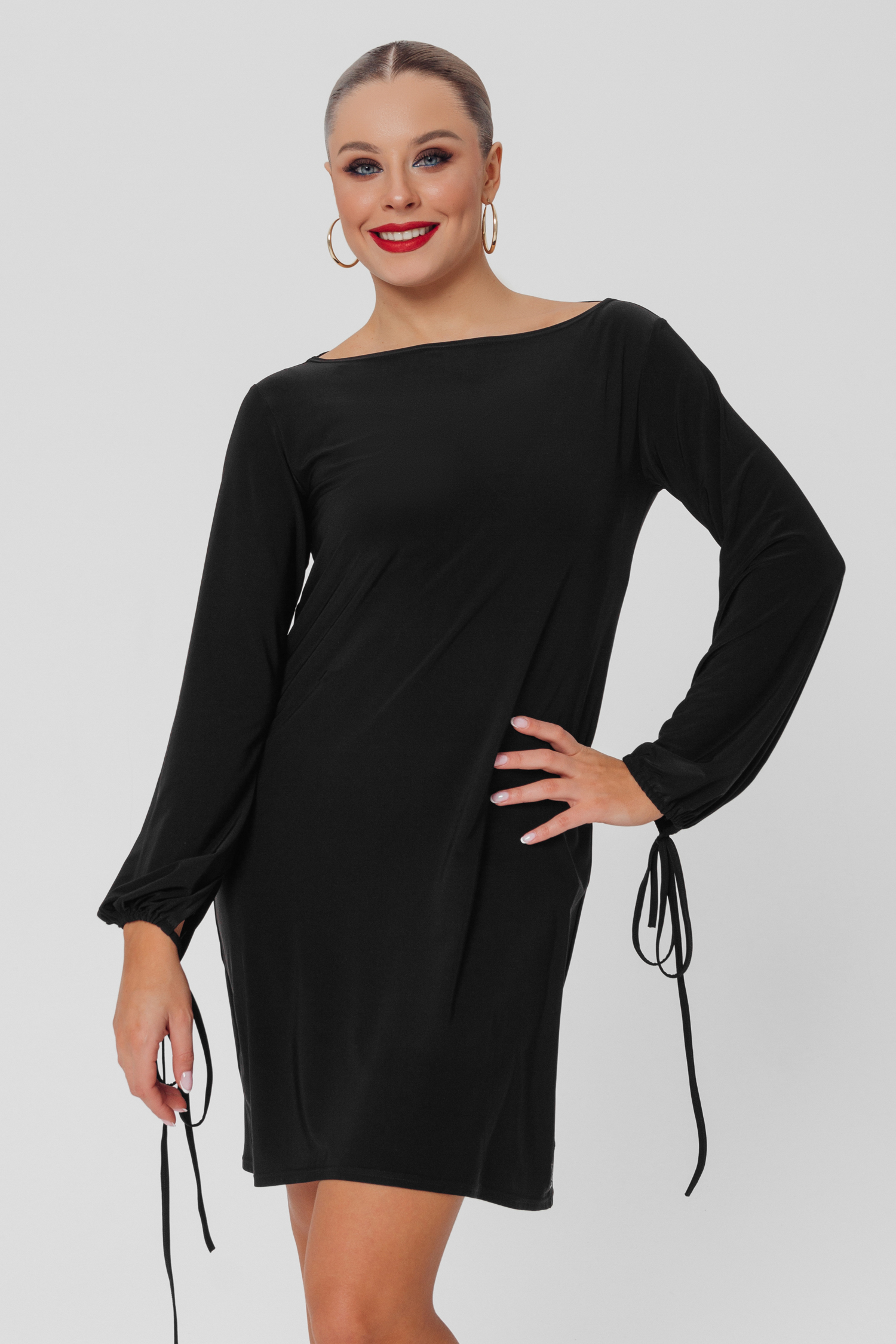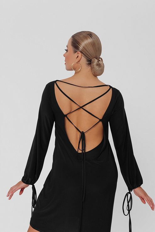 Эффектное платье мини с расширенными рукавами на завязках и экстравагантной открытой спиной со шнуровкой от бренда FARANDOLE. В таком платье особенно подчеркивается красота танцевальных ног, а также грациозная спина.