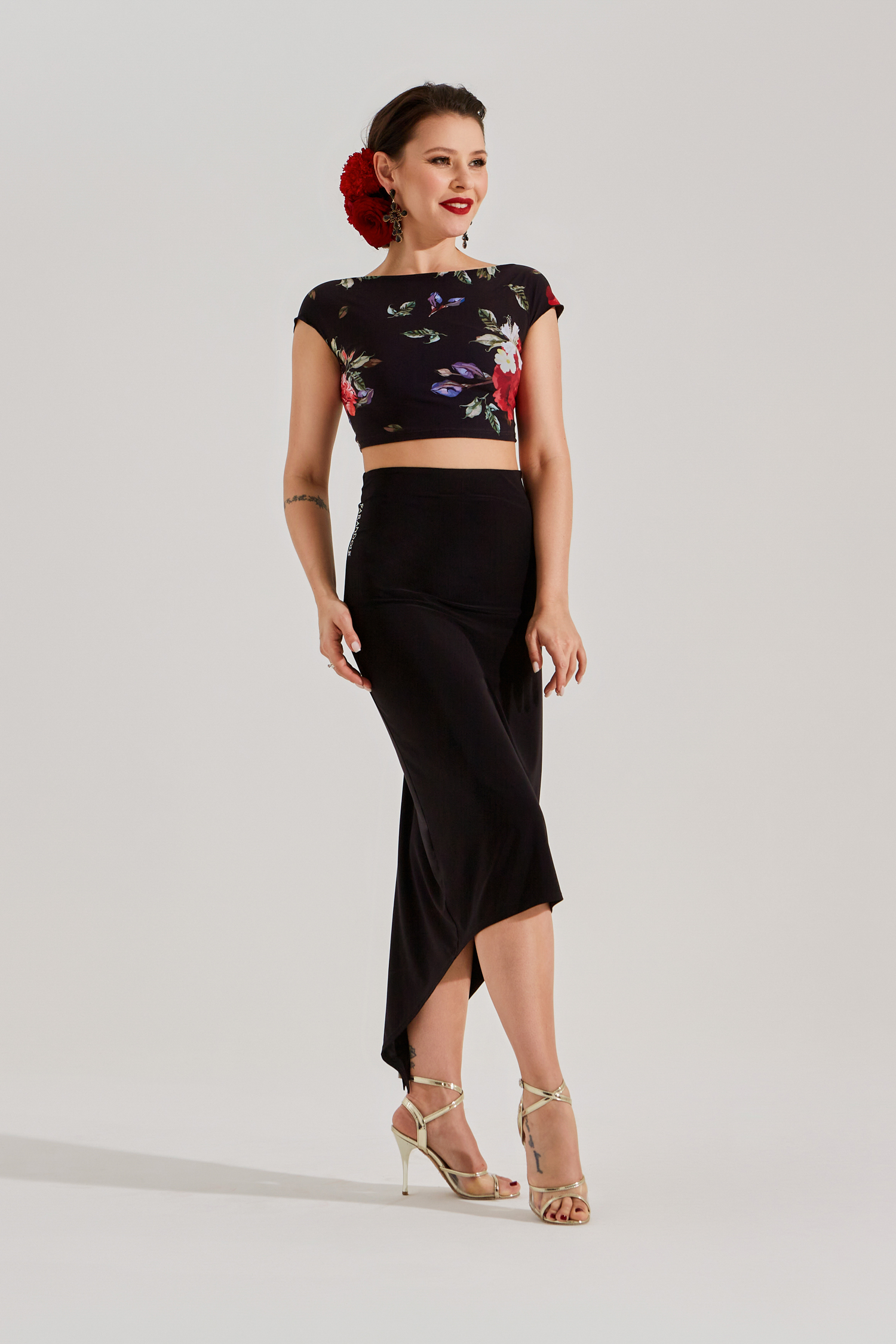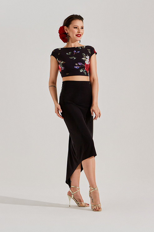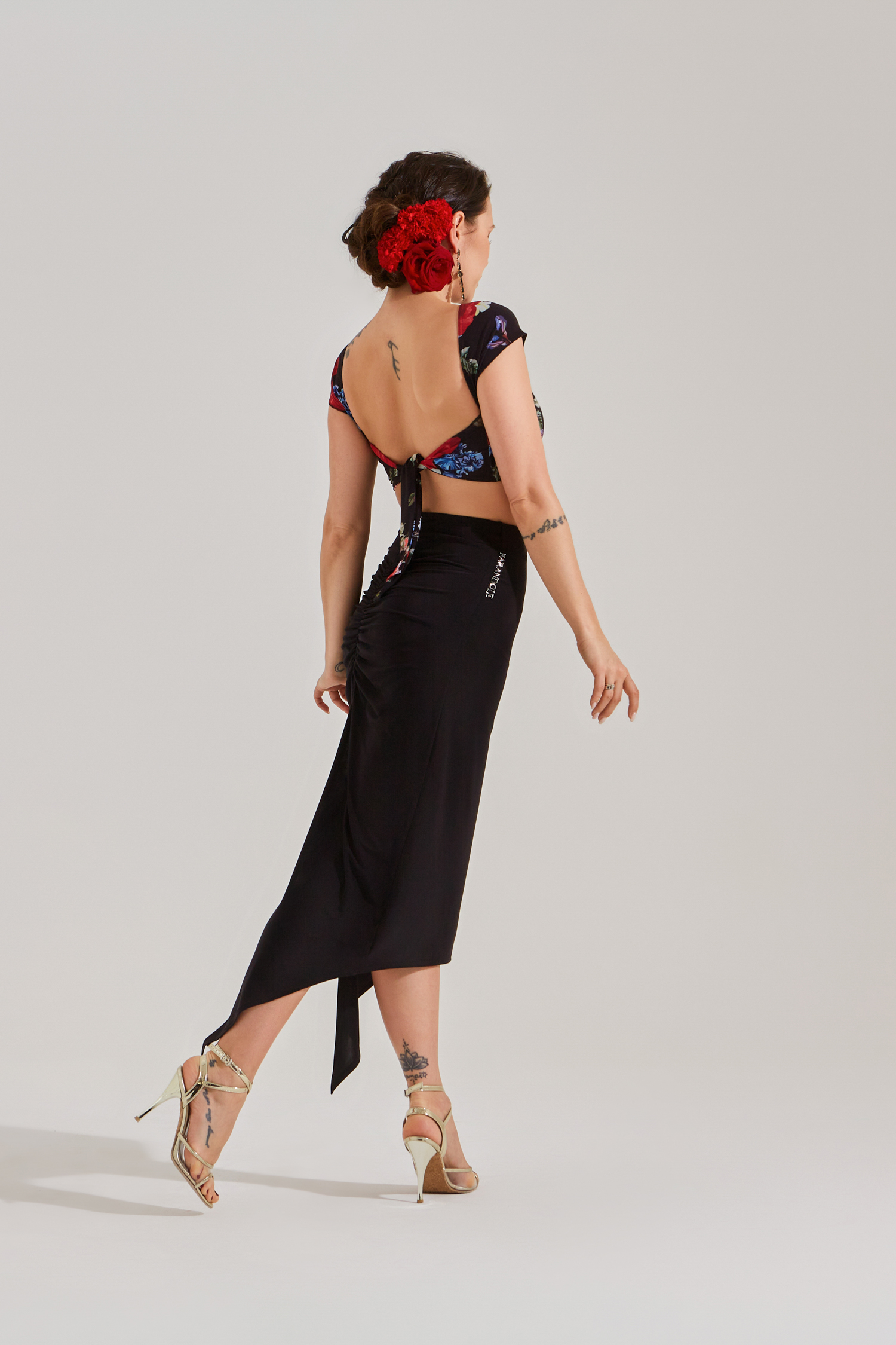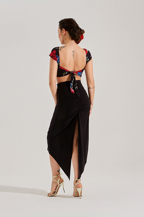 Юбка на высокой талии с пикантной сборкой и эффектным разрезом и хвостиками — прекрасный выбор для практик аргентинского танго. В юбку вшиты шортики. Красиво сочетается с любым топом, блузкой или боди из коллекции DOLCE TANGO.