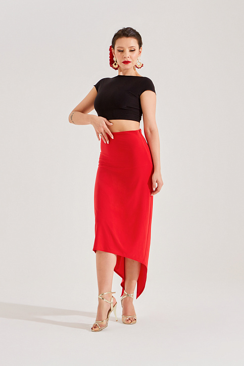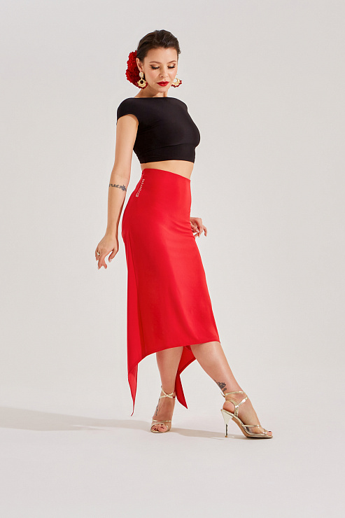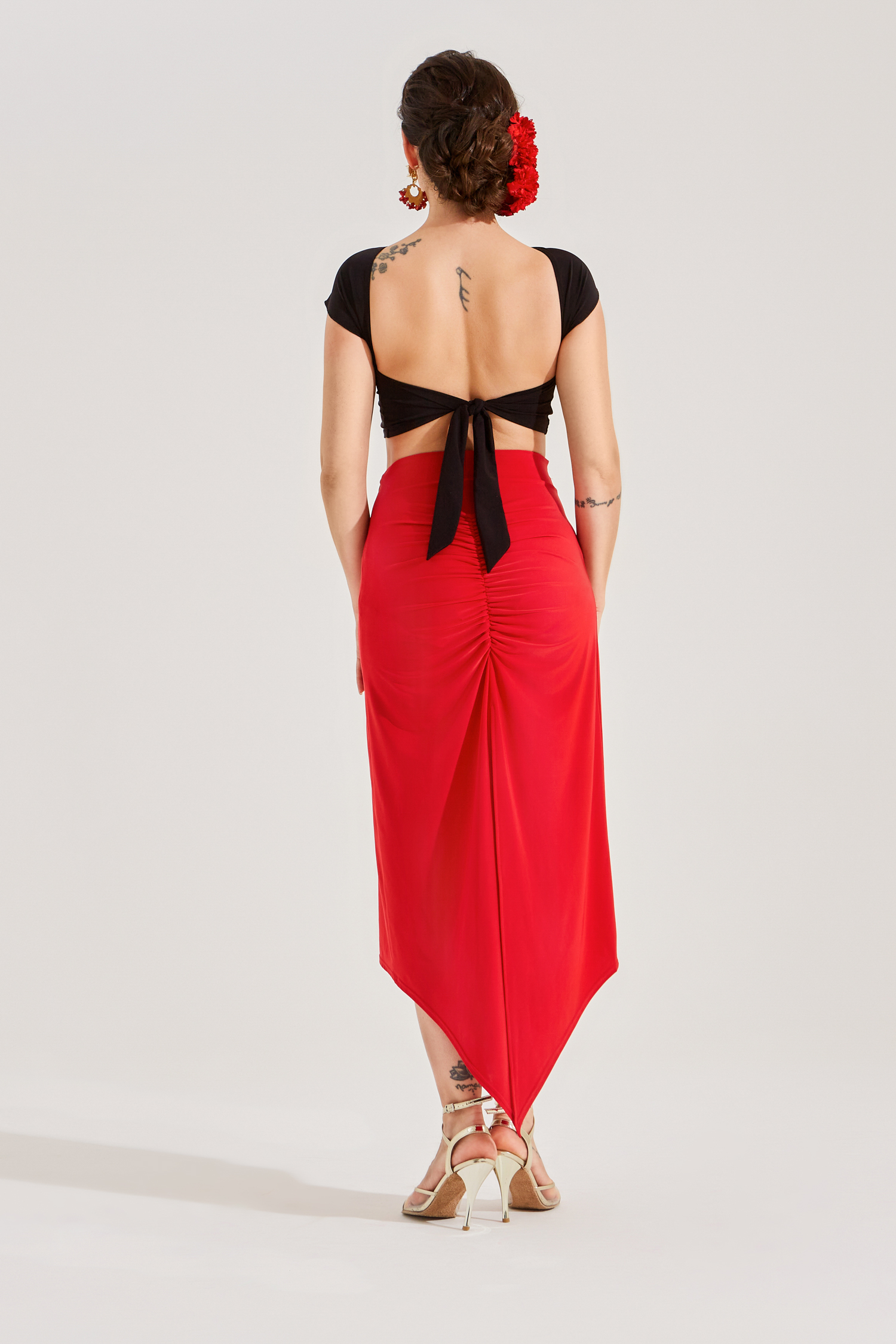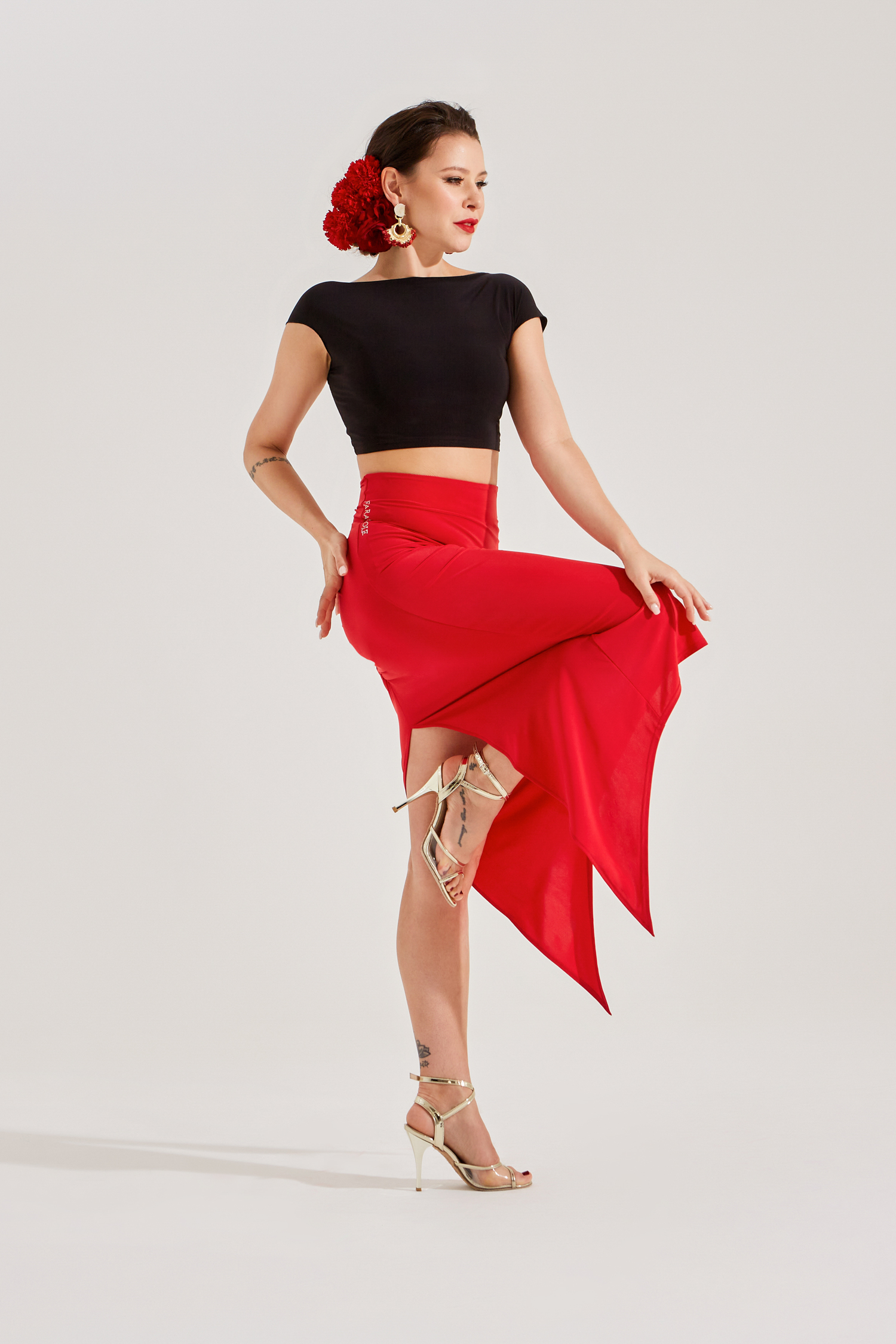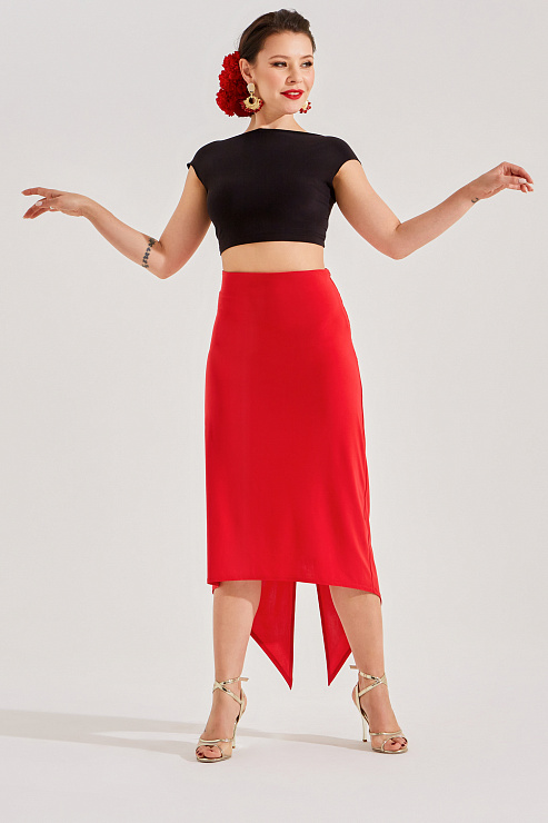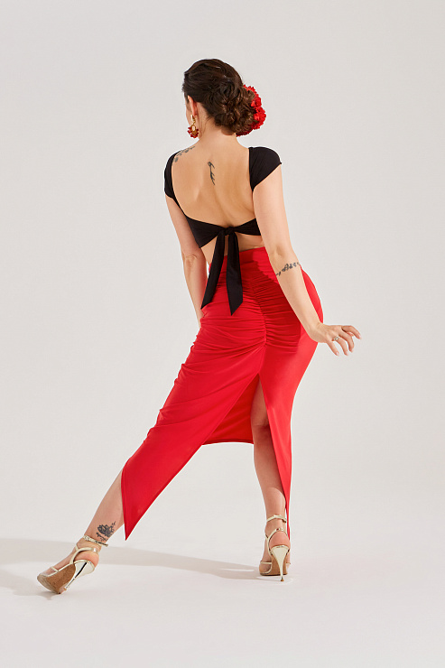 Юбка на высокой талии с пикантной сборкой и эффектным разрезом и хвостиками — прекрасный выбор для практик аргентинского танго. В юбку вшиты шортики. Красиво сочетается с любым топом, блузкой или боди из коллекции DOLCE TANGO.