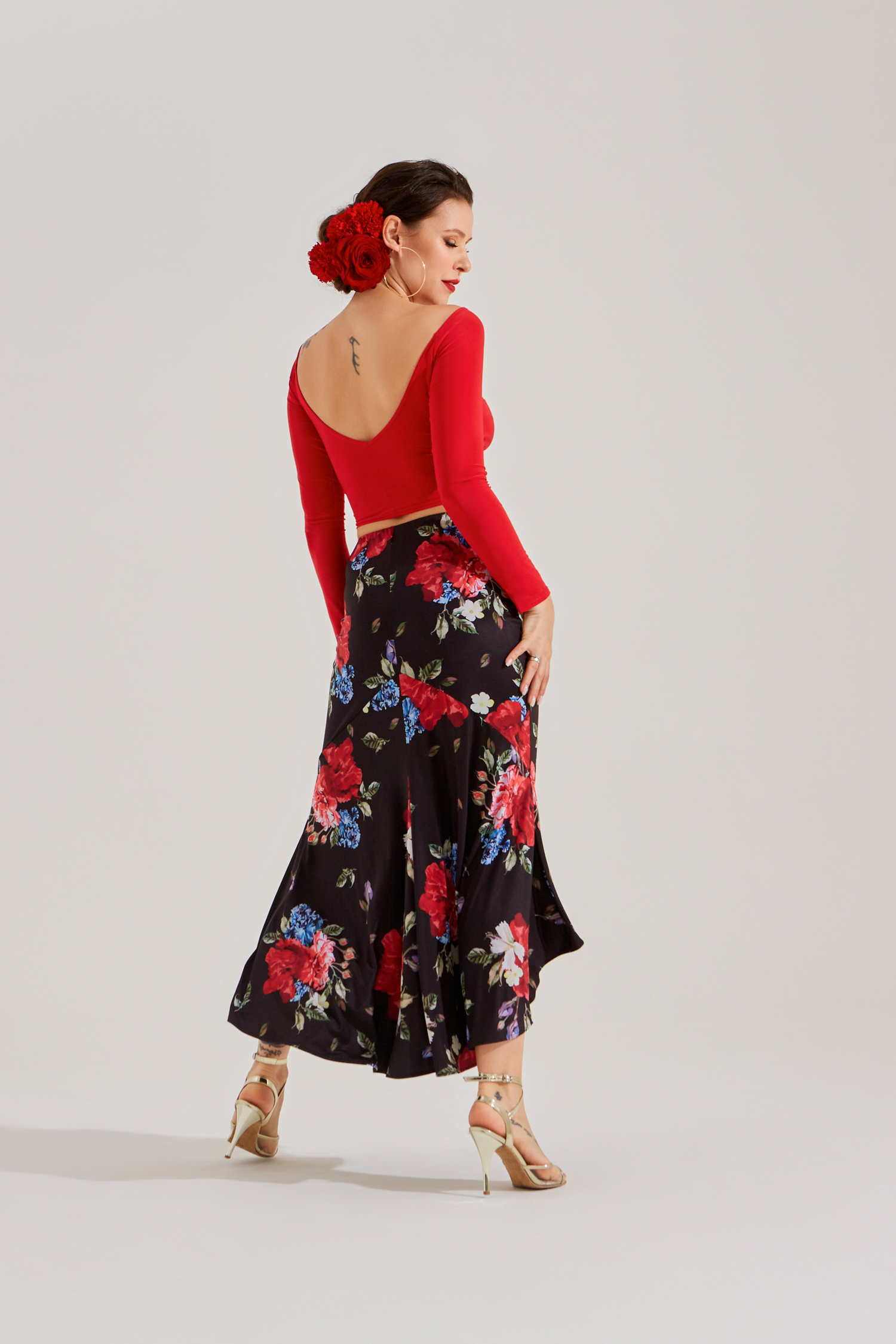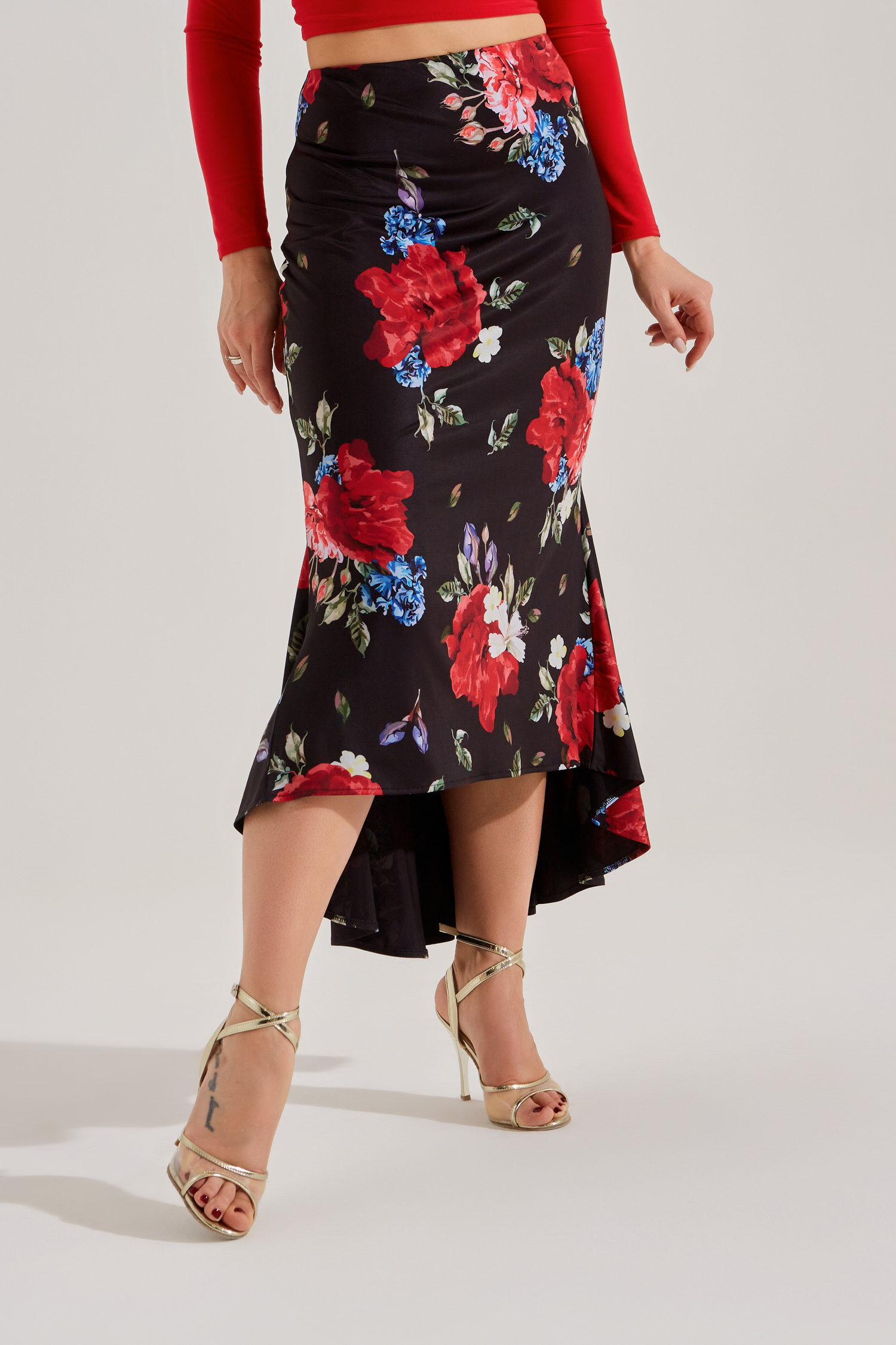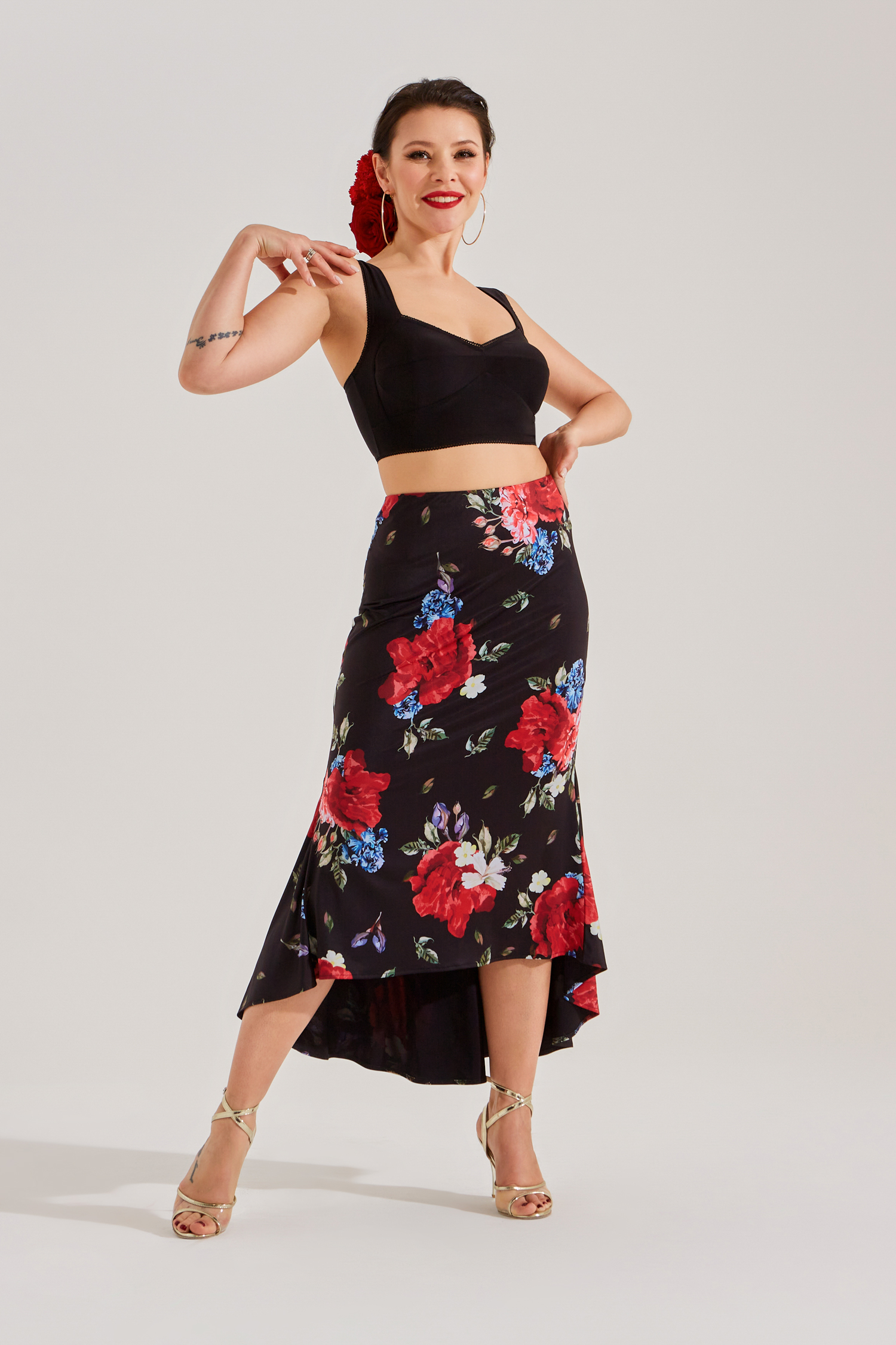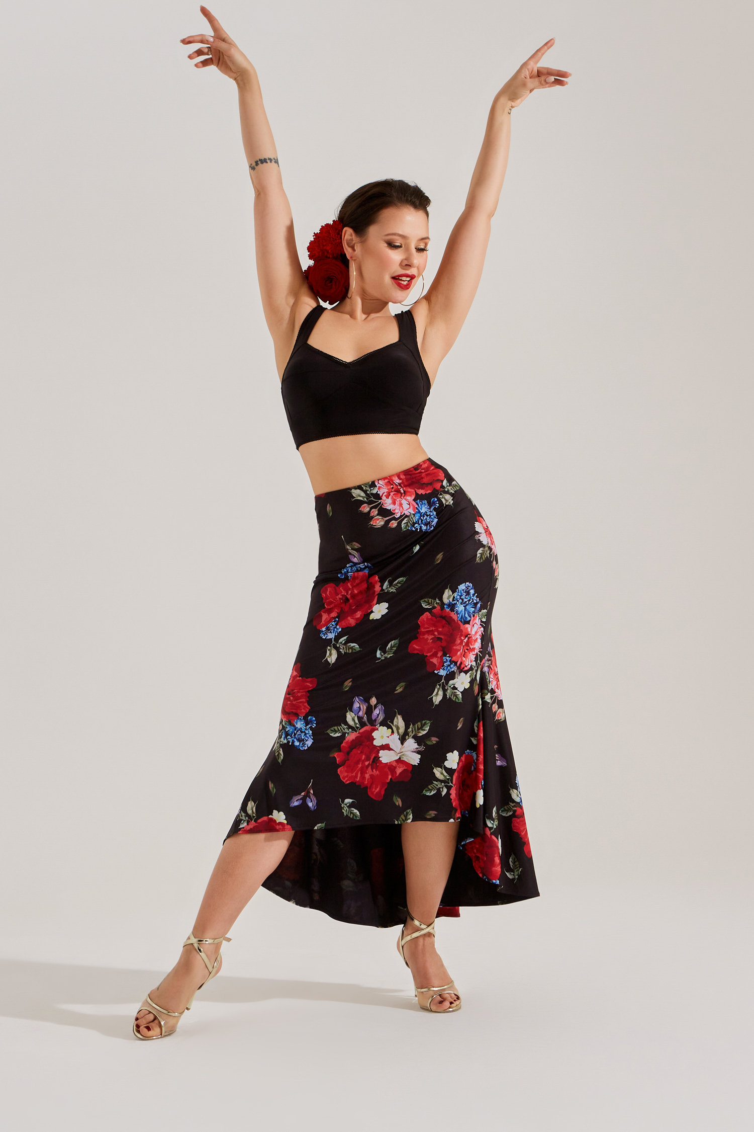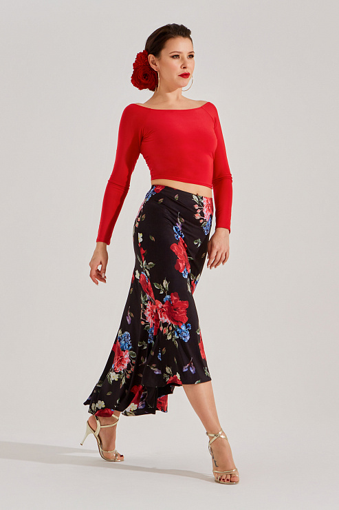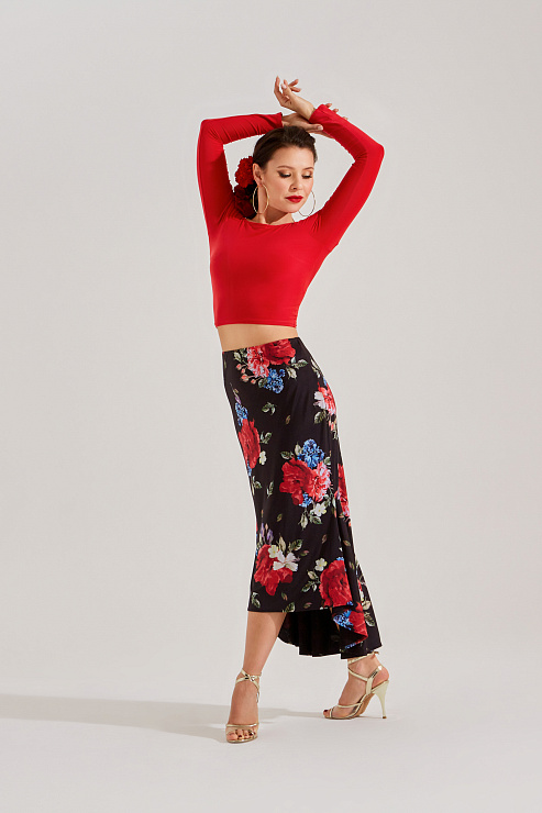 Юбка для танго с двумя большими клиньями и расширением по низу очень эффектна в движении. Идеально сочетается с любыми топами или боди из танго коллекции. В комплекте с боди такого же цвета комплект смотрится целостно как платье. В авторском цветочном принте юбка выглядит особенно ярко, женственно и стильно.