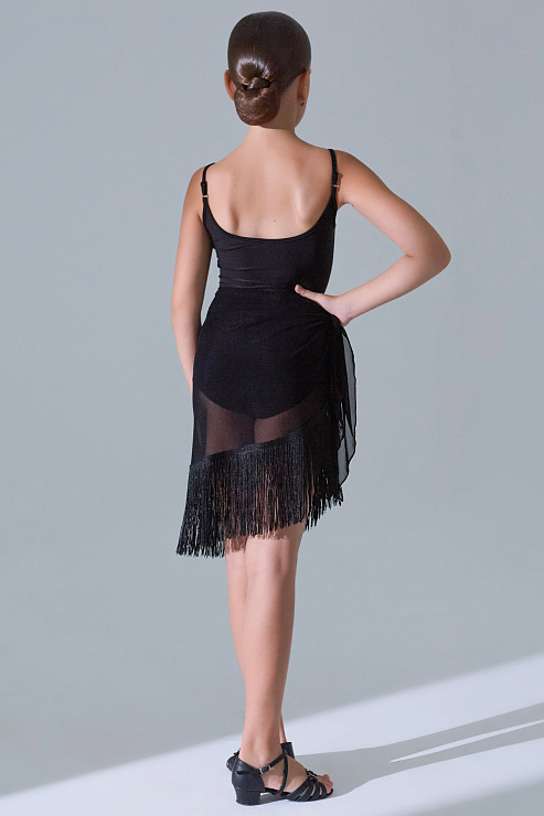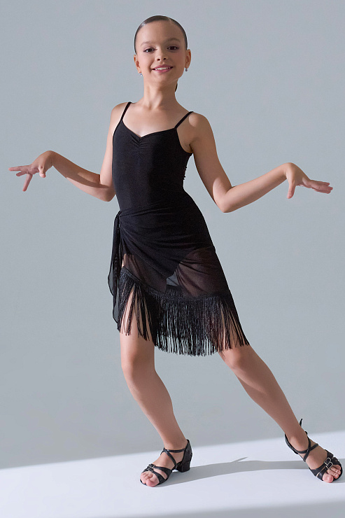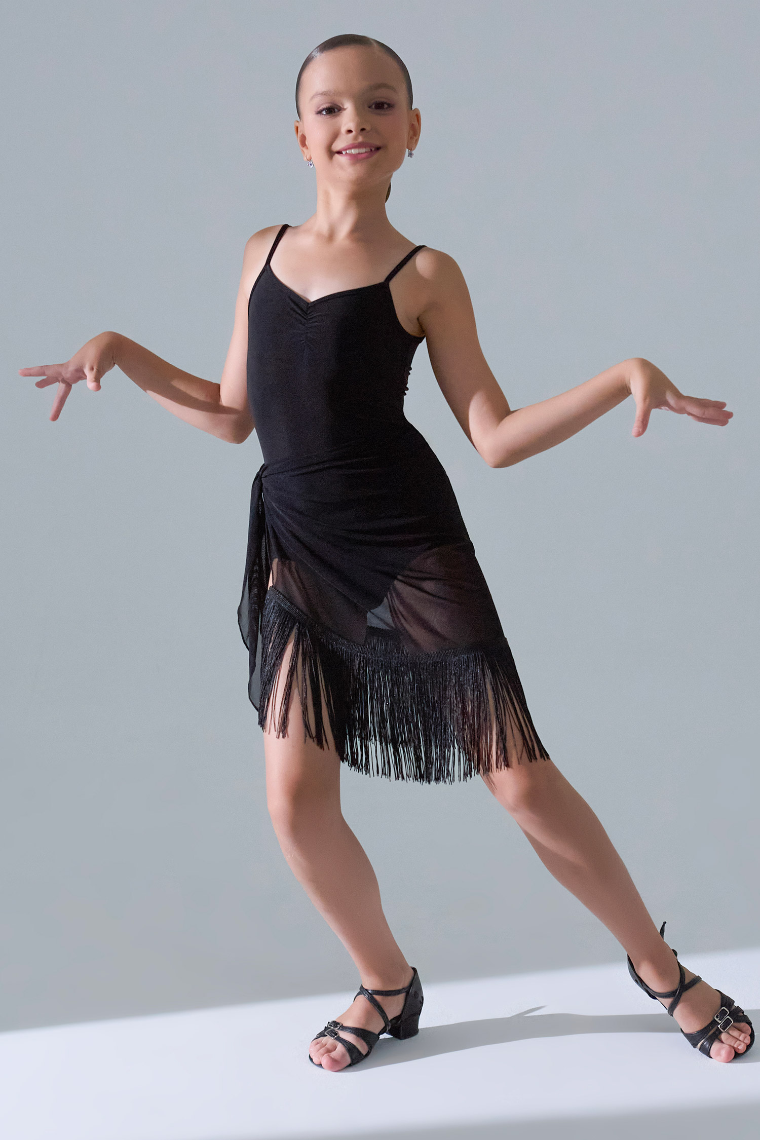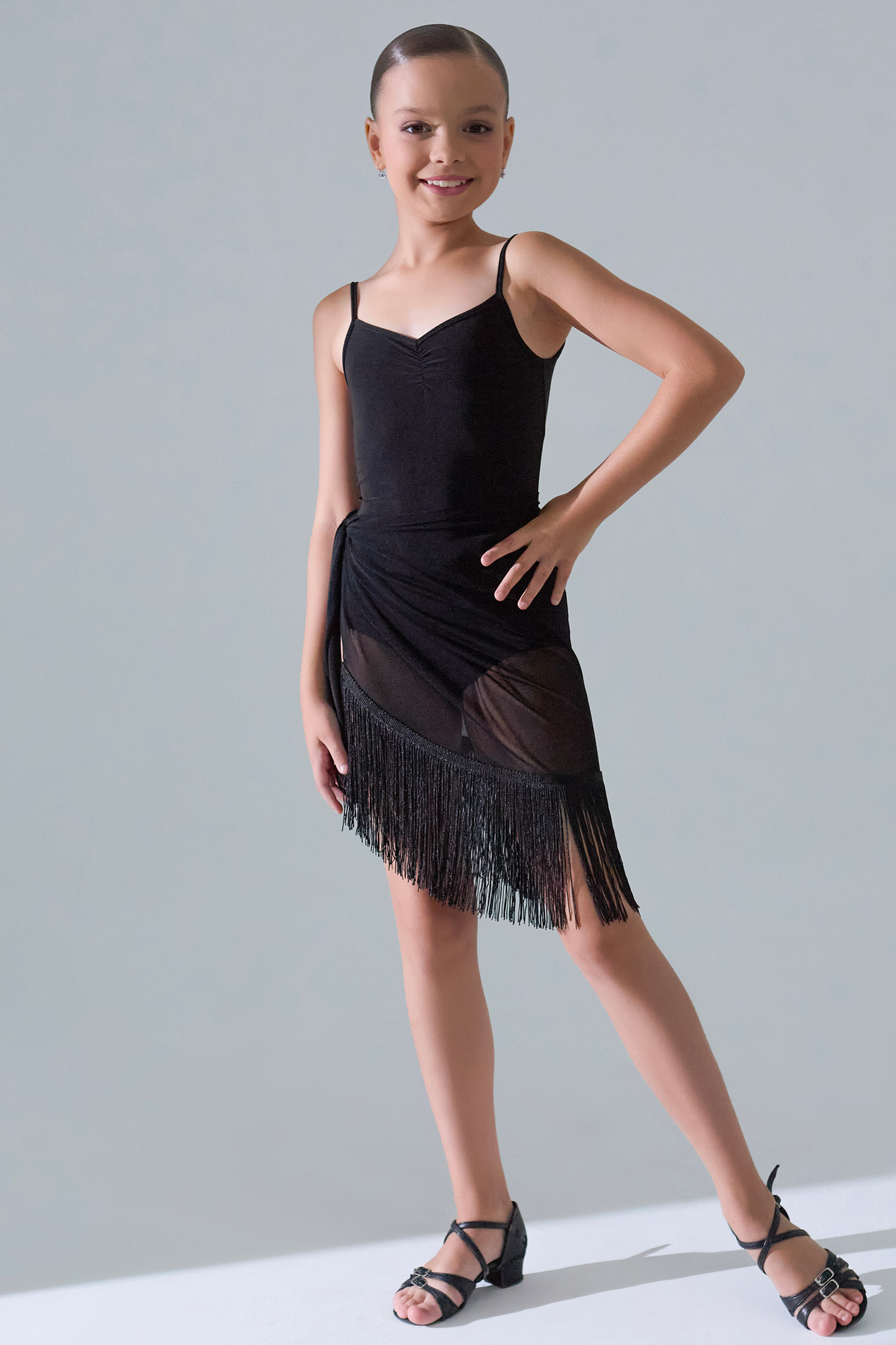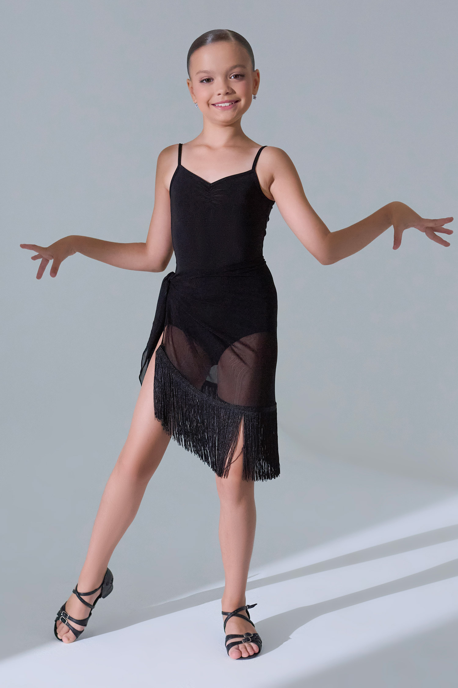 Детский набедренный платок с длинными завязками и бахромой от бренда танцевальной одежды FARANDOLE из сетки-стрейч и бахромой — очень нужная вещь в гардеробе танцора. Рекомендуем повязывать платок поверх боди и образ будет завершен.
